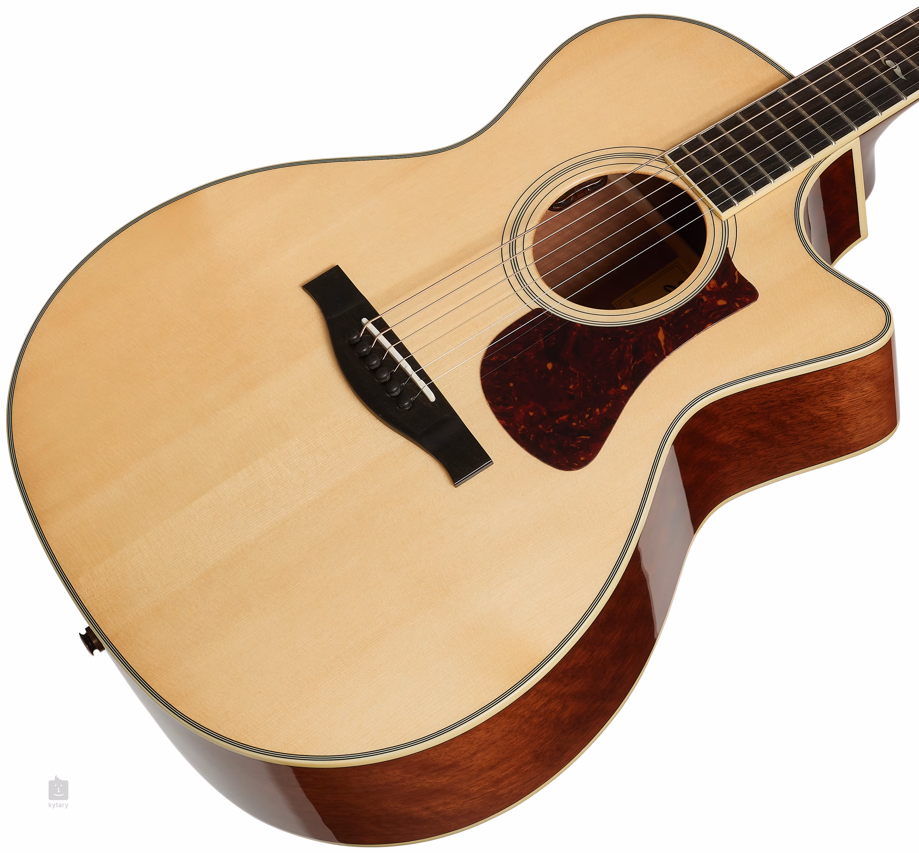 La découpe arrondie de la partie inférieure du corps assure une bonne correspondance aux positions des frettes supérieures, tandis que l'orientation sur la touche est facilitée par des repères de position perlés sur les septième et douzième frettes. La résonance de la table est favorisée par des nervures taillées à la main (Scalloped X).