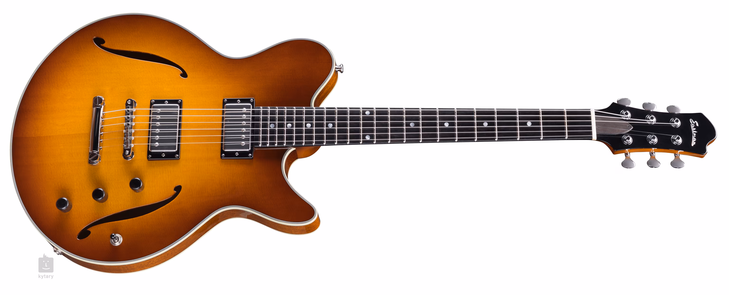 La Eastman Romeo est une guitare électrique semi-hollowbody au design moderne et élégant. L'avant de la guitare est en épicéa massif, tandis que le dos et les éclisses sont en acajou stratifié. Une touche en ébène de vingt-deux frettes est collée sur le manche en érable. L'orientation sur la touche est facilitée par des points de positionnement perlés.