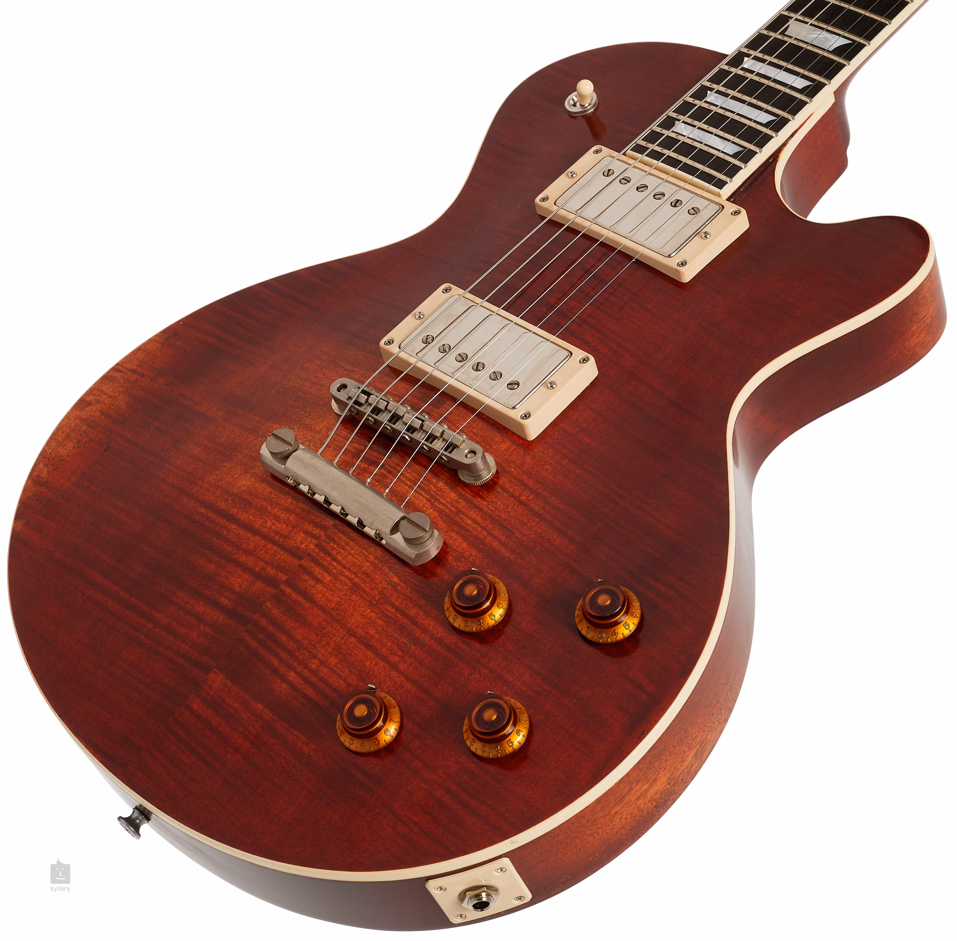 Deux humbuckers Lollar Custom Aged/Wound Imperial confèrent à la guitare un son de micro PAF des années 1950 propre, chaud et dynamique qui se démarquera dans le rock, le blues et une variété d'autres genres musicaux. Ajustez le caractère du son à l'aide des commandes standard. Les cordes sont montées dans des mécaniques Gotoh et passent par un chevalet Gotoh GE-104B-NI Relic de la même marque. La belle finition est accentuée par la table et la touche en imitation ivoire, l'accastillage avec des éléments de patine subtile (Aged Nickel) et le logo de la société en nacre sur la tête de la guitare.