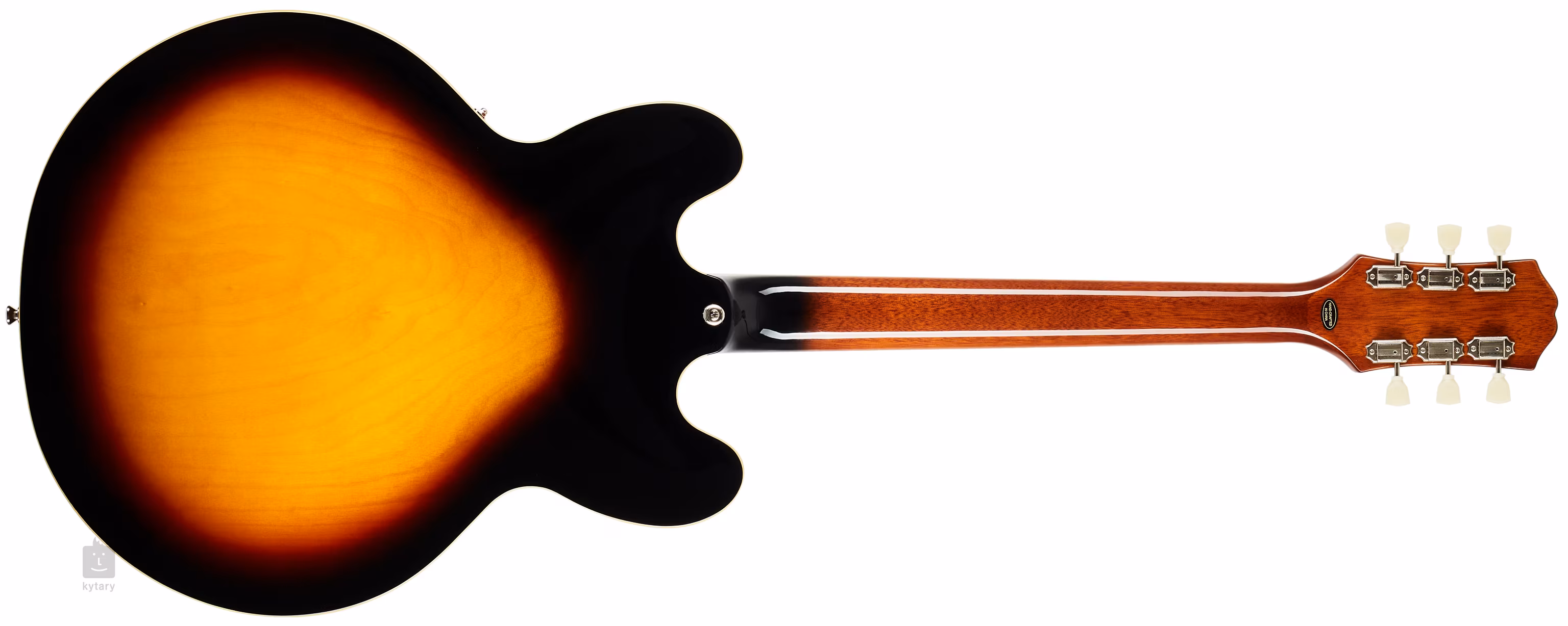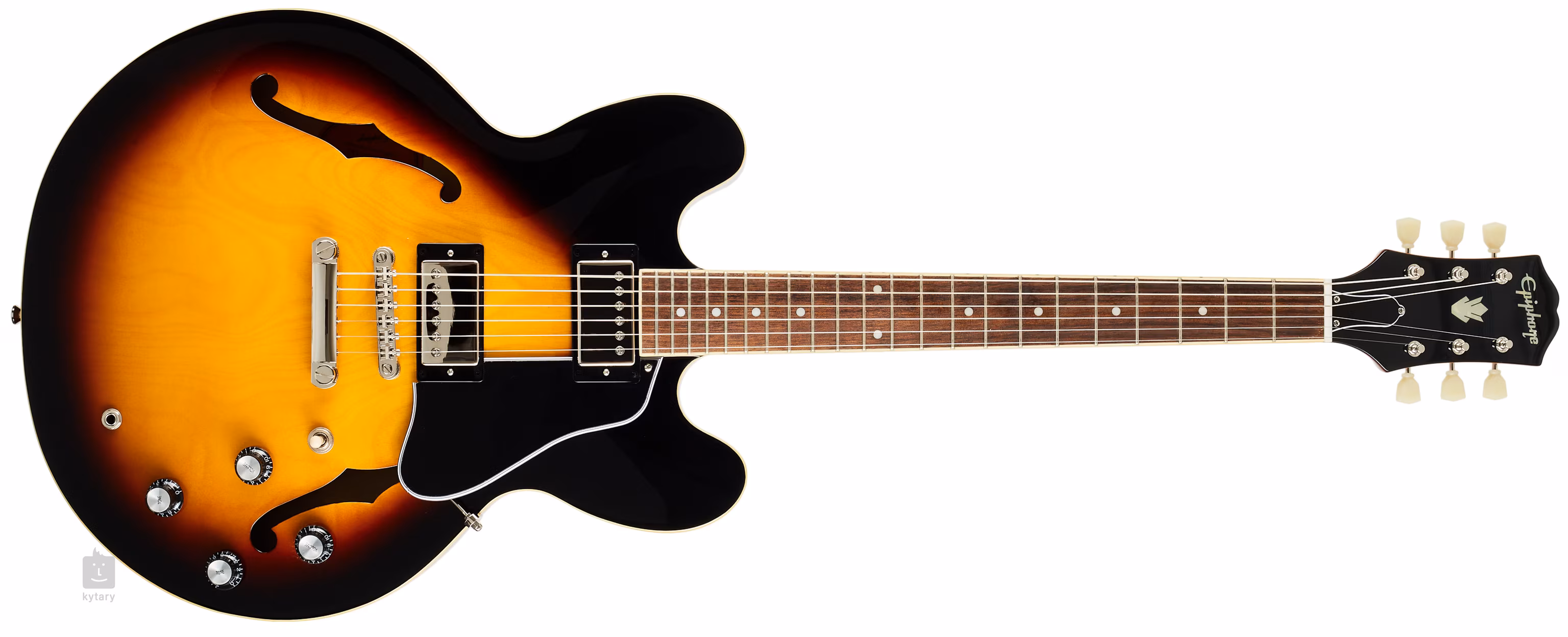 Les guitares électriques semi-hollowbody Epiphone ES-335 sont des copies plus abordables des guitares Gibson ES-335 introduites en 1958. Le corps du modèle ES-335 Vintage Sunburst est fait de contreplaqué et d'un bloc central en érable massif. Le manche en acajou est doté d'une touche en figue avec vingt-deux frettes Medium Jumbo. Les blocs de position (trapézoïdaux) facilitent l'orientation sur la surface de la touche.