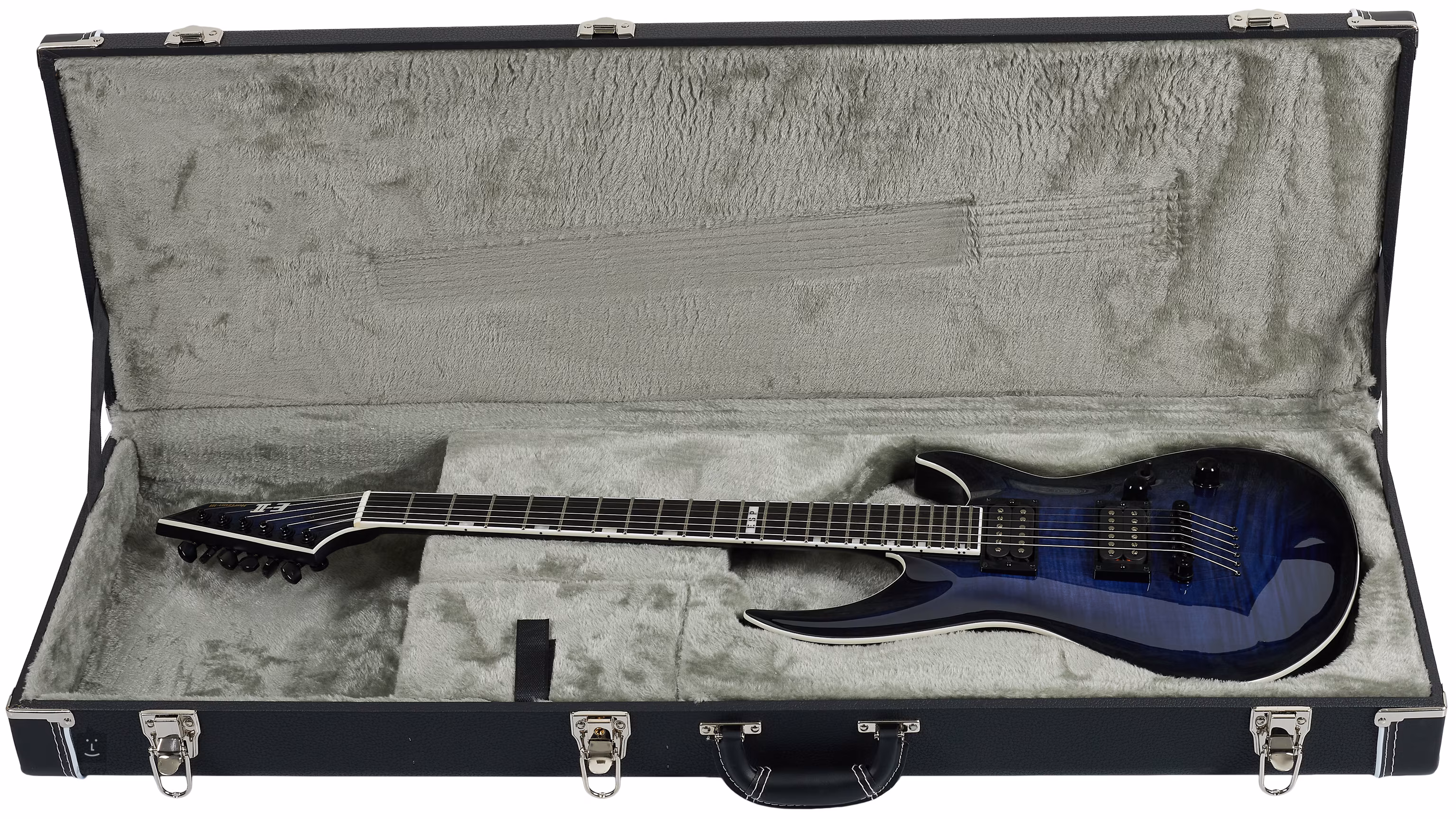 Les guitares électriques Horizon III se distinguent des types conventionnels par le contraste entre les coins supérieurs allongés et les coins inférieurs raccourcis du corps de l'instrument. Le modele E-II Horizon-III FR attire l'attention au premier coup d'oil avec sa table en érable ondé en bleu renne et ses bordures brillantes contrastantes. Le corps de la guitare lui-meme est en aulne. Un manche en érable en trois parties avec un profil en U plus étroit est rejoint par une touche en ébene avec vingt-quatre frettes Extra Jumbo. L'orientation sur sa surface est facilitée par des blocs de position en nacre.