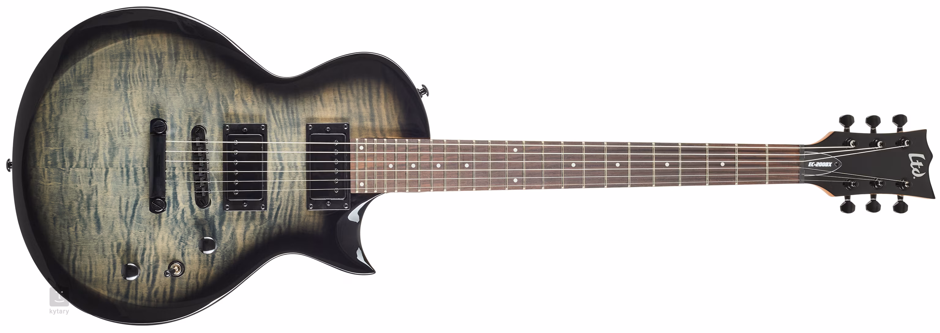 Le corps plat en peuplier aux bords arrondis du modèle EC-200DX CHARCOAL BURST est orné d'un placage spectaculaire en érable flammé. Une touche en palissandre avec vingt-quatre frettes Extra Jumbo est collée sur un manche en érable grillé boulonné. Des points de positionnement sur la touche facilitent l'orientation.