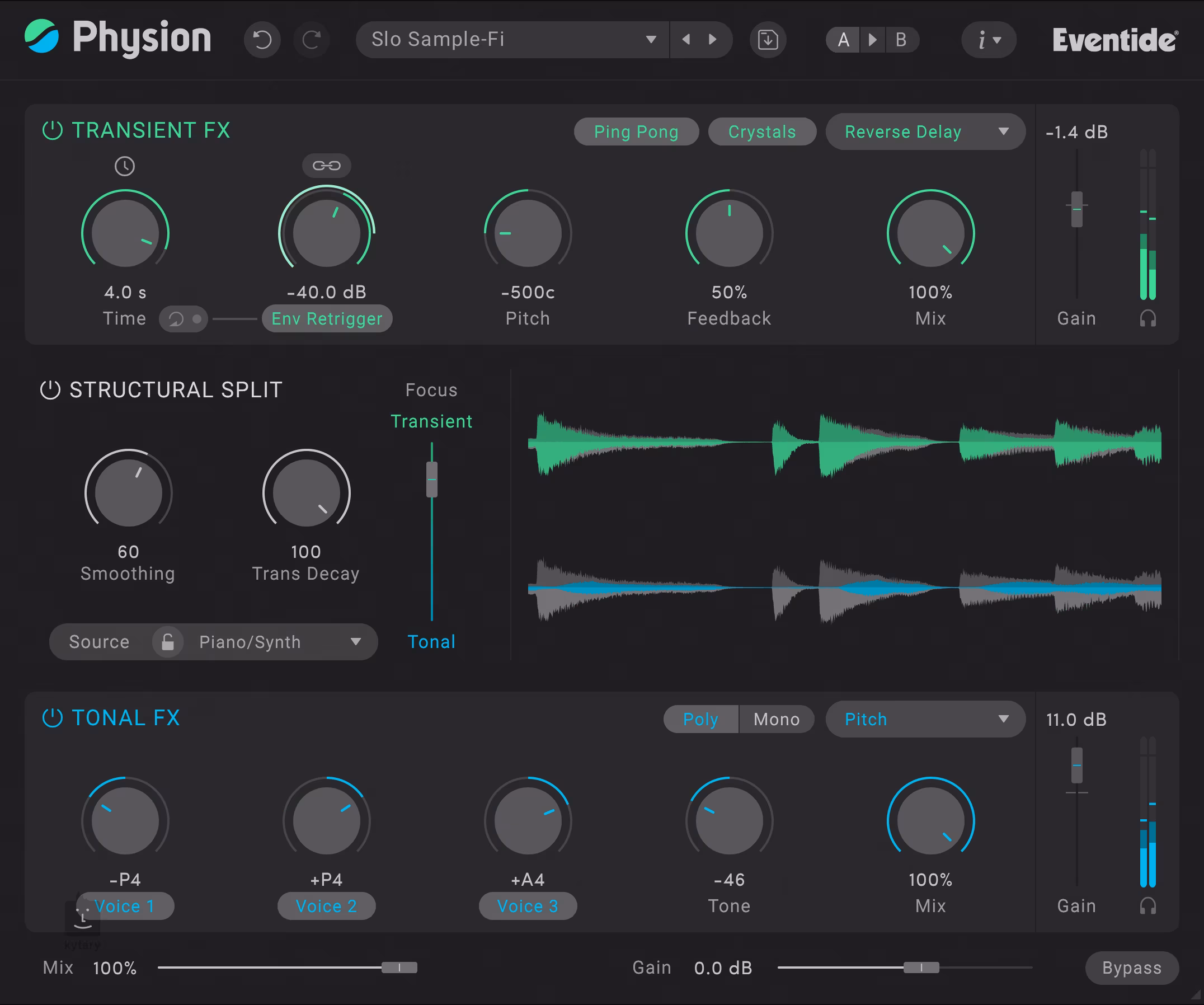 Cet outil associe des commandes intuitives à une sélection d'effets Eventide de premier ordre, nouvellement optimisés pour les composantes transitoires ou tonales. Le pitch-shifting polyphonique amélioré, les délais inversés avec des modes tels que Crystals ou Ping-pong, les filtres avancés de SplitEQ ou la prise en charge des entrées side-chain élargissent tous votre répertoire sonore, de l'accentuation subtile aux transformations radicales.