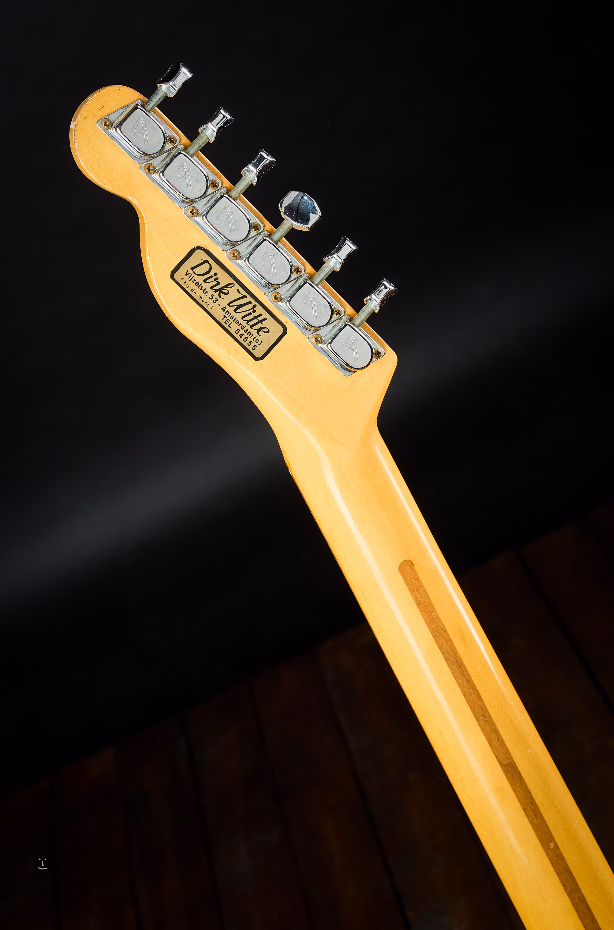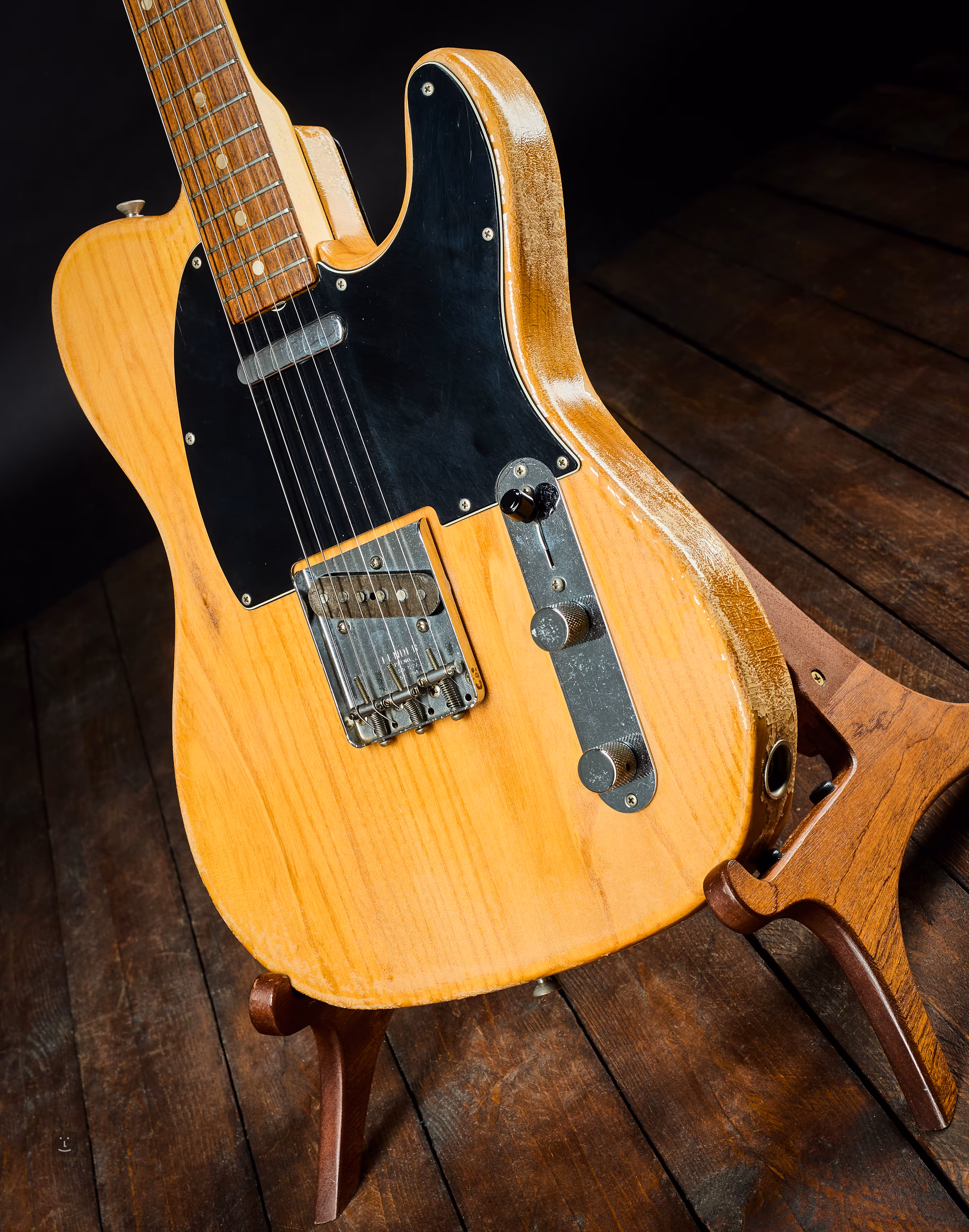 Le vernis d'origine sur le corps a probablement été poncé et repeint avec une nouvelle couche, mais il n'a pas bien adhéré au support et se détache donc progressivement en petites particules ; il s'agit d'un polyuréthane plus récent ; le vernis sur le manche, en revanche, est d'origine et intact, de sorte que le manche a l'air standard.