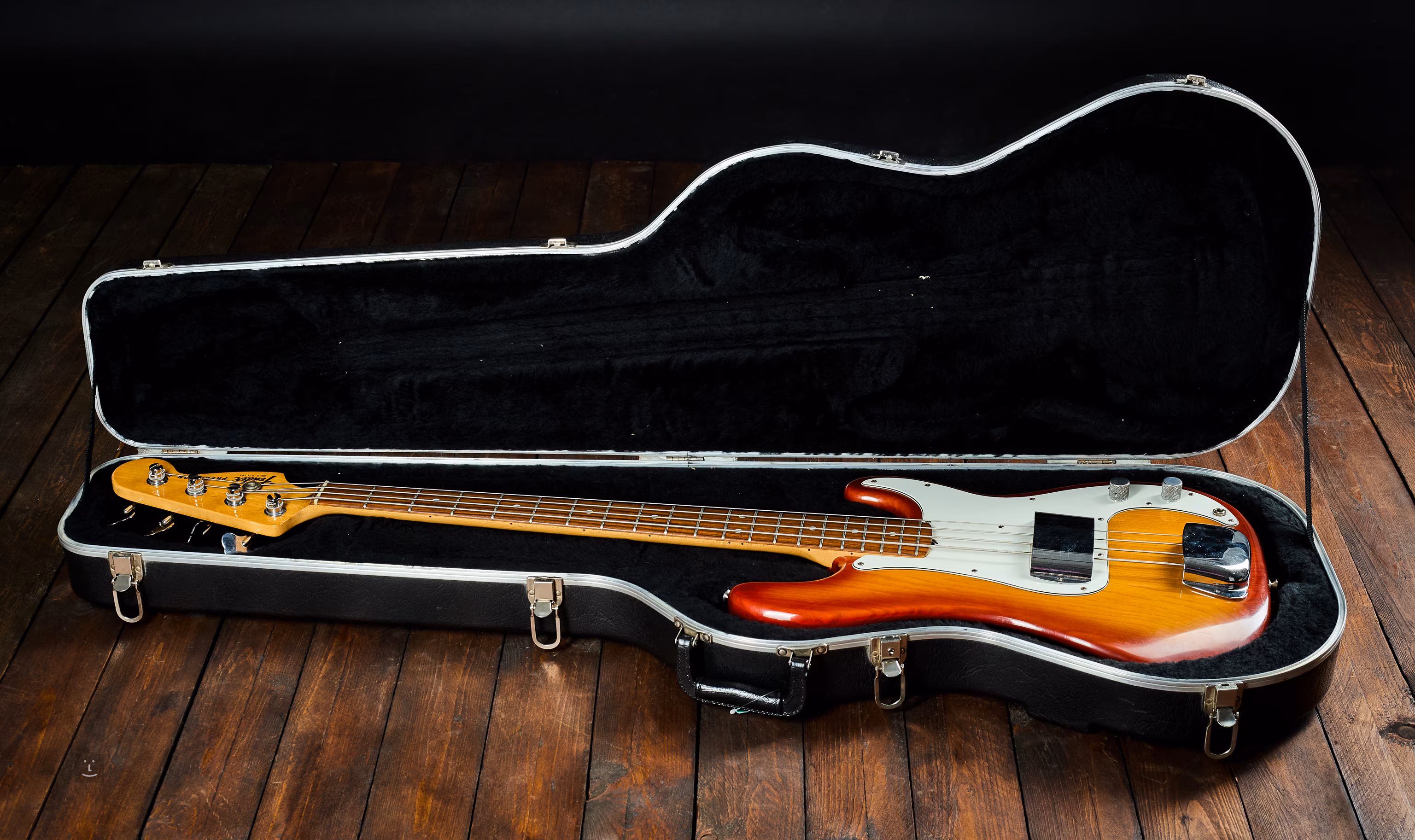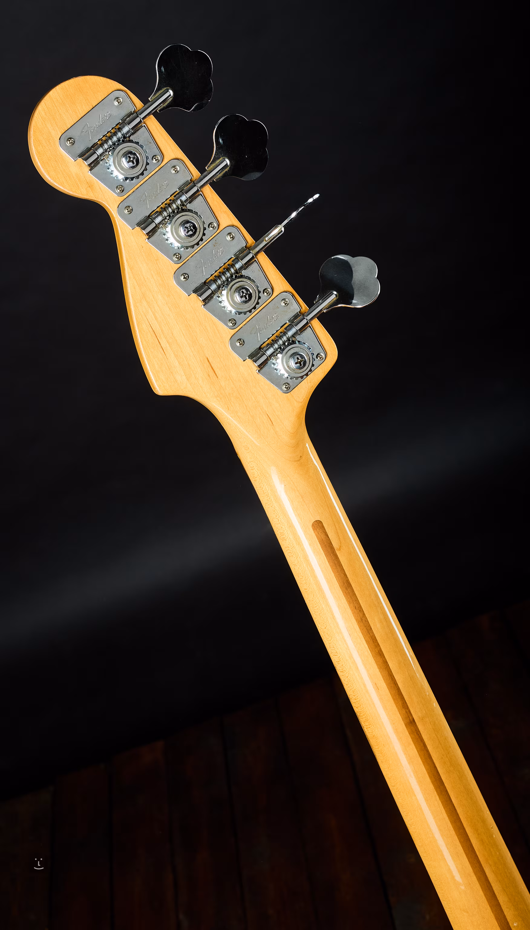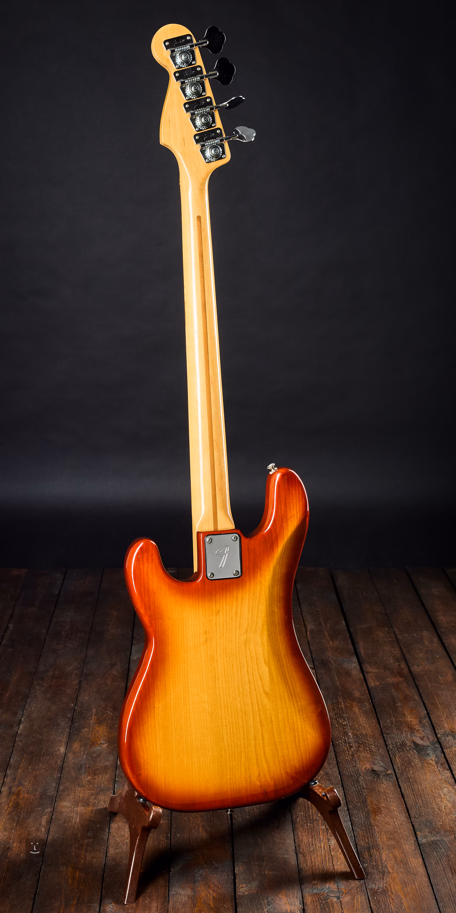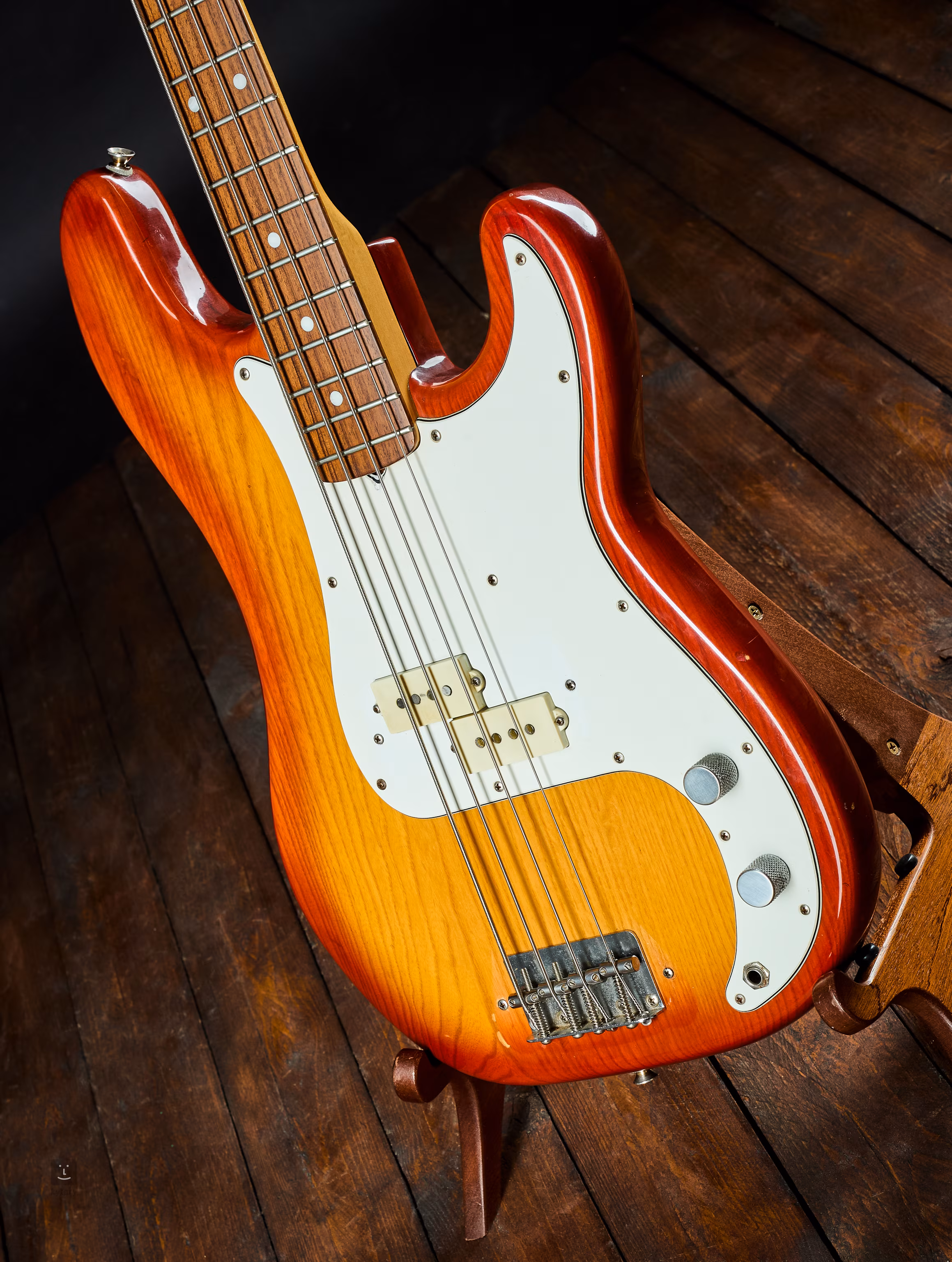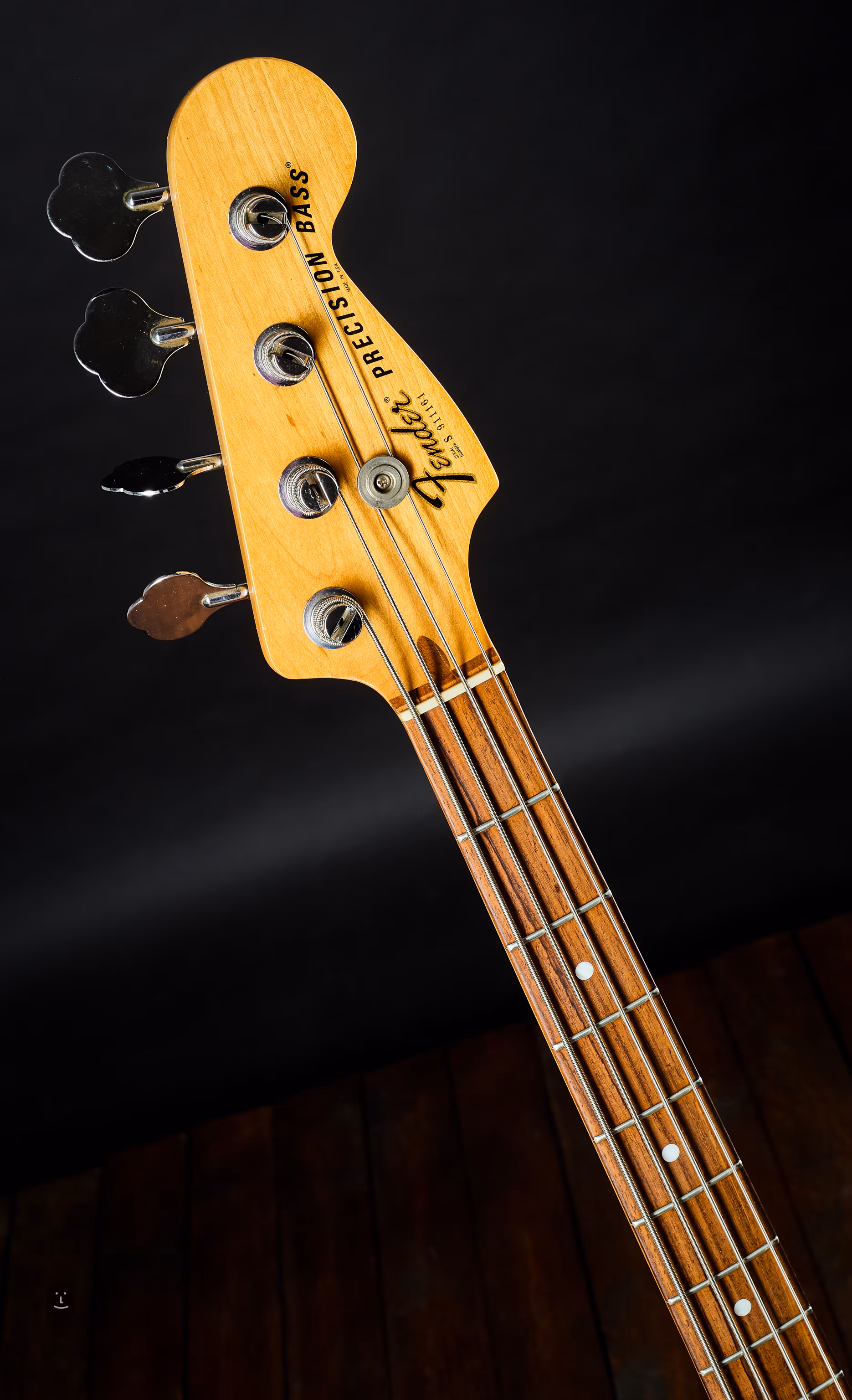 La fin de l'ère de l'usine Fender de Fullerton au début des années 1980 s'est accompagnée de nouvelles couleurs et d'un contrôle de qualité plus strict. Cette Precision, avec un corps en frêne Sienna Burst, possède un pickguard blanc incluant les traditionnels capots de micros à double bobinage (ces derniers sont encore vintage avec un fond gris en papier pressé) ; la tête du manche porte le numéro de série "S", se référant à la fin des années 1970. L'intérieur du manche est daté de 1982, les potentiomètres sont d'origine et datent de 1978.