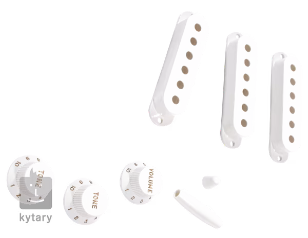 Un ensemble de pièces de rechange authentiques pour la Stratocaster. Cet ensemble comprend des couvercles de potentiomètre de volume et deux de tonalité, ainsi que trois couvercles de micro à simple bobine.
