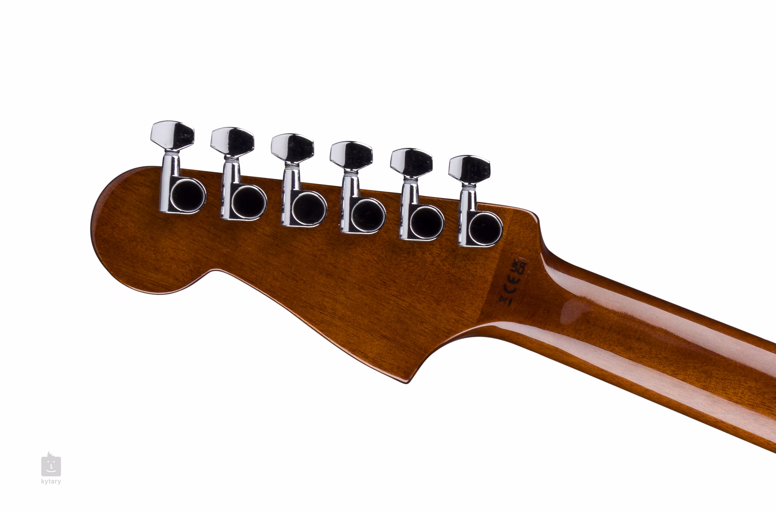 Les cordes sont montées sur la frette zéro en micarta composite, la mécanique chromée de l'entreprise, moulée sous pression, et la touche en noyer. Le style est accentué par le design Jazzmaster de la tête, la finition sunburst de la table d'harmonie et le pickguard noir simple couche.