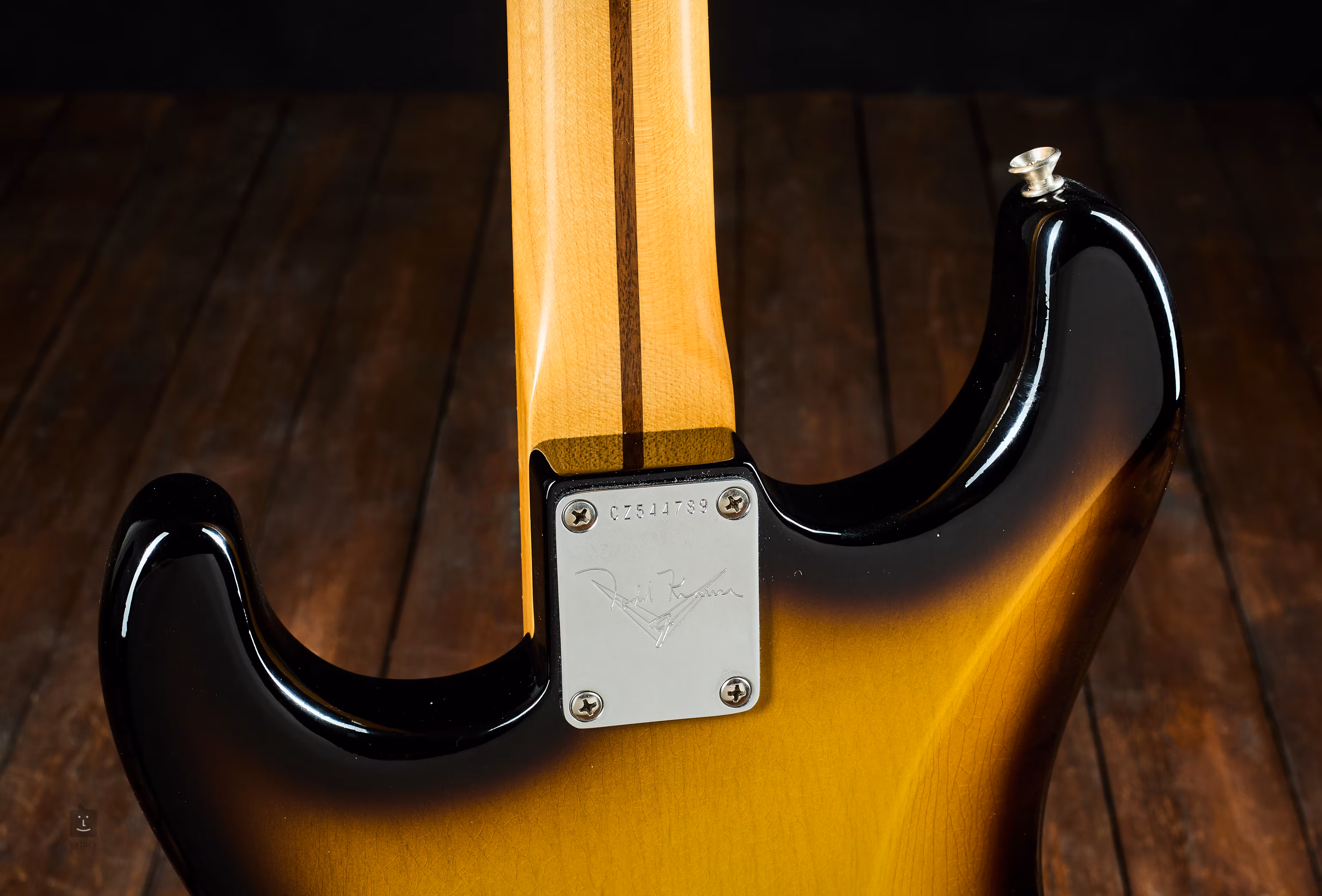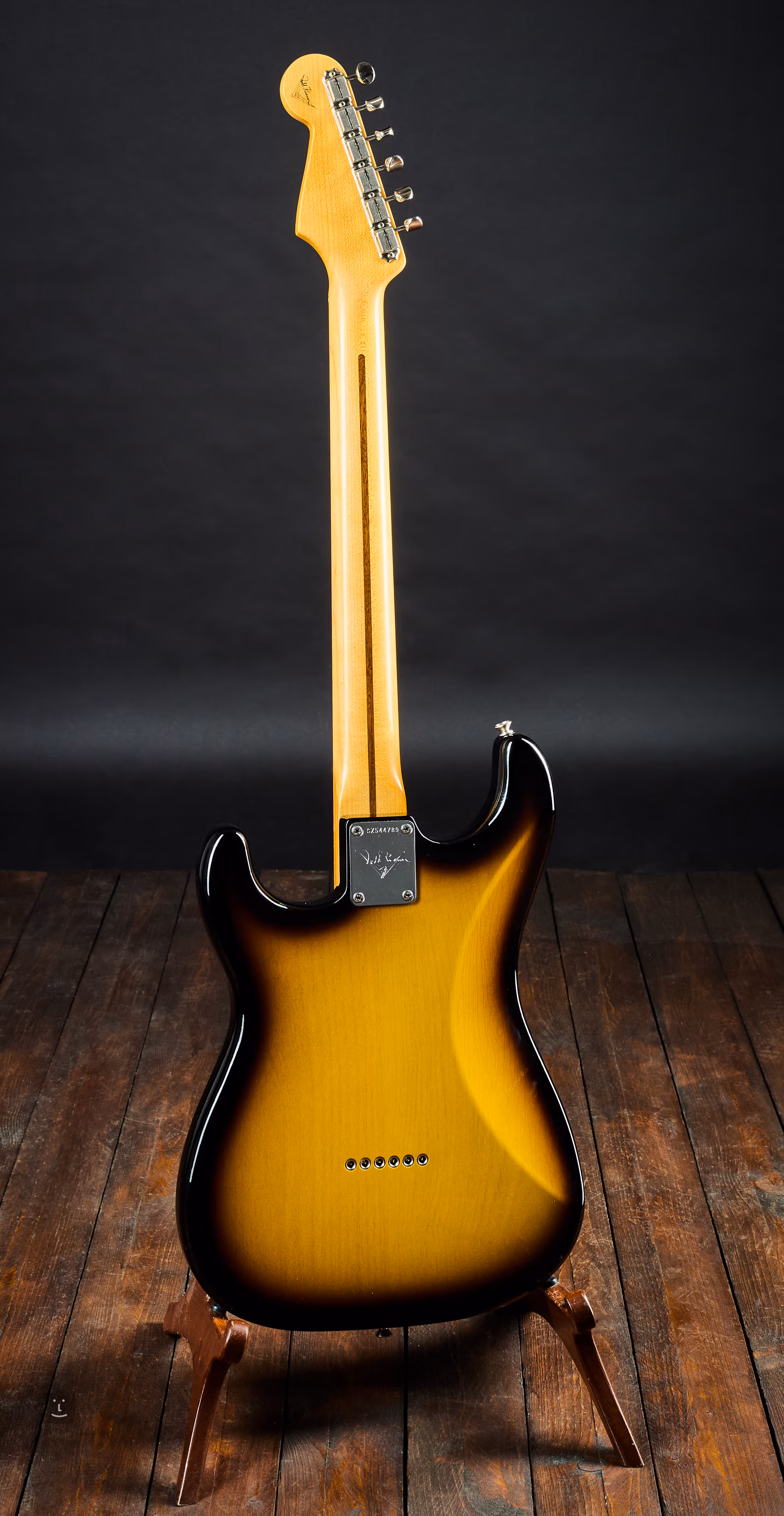 Strat avec trois simples, corps en aulne 2-Color-Sunburst et manche en érable quart de scie ; profil de manche 60 Style Oval C ; rayon de 9,5" ; 21 frettes Type 6105 Narrow Tall ; micros '57 bobinés à la main au manche et au milieu (RWRP), Fat 50 bobinés à la main au chevalet.