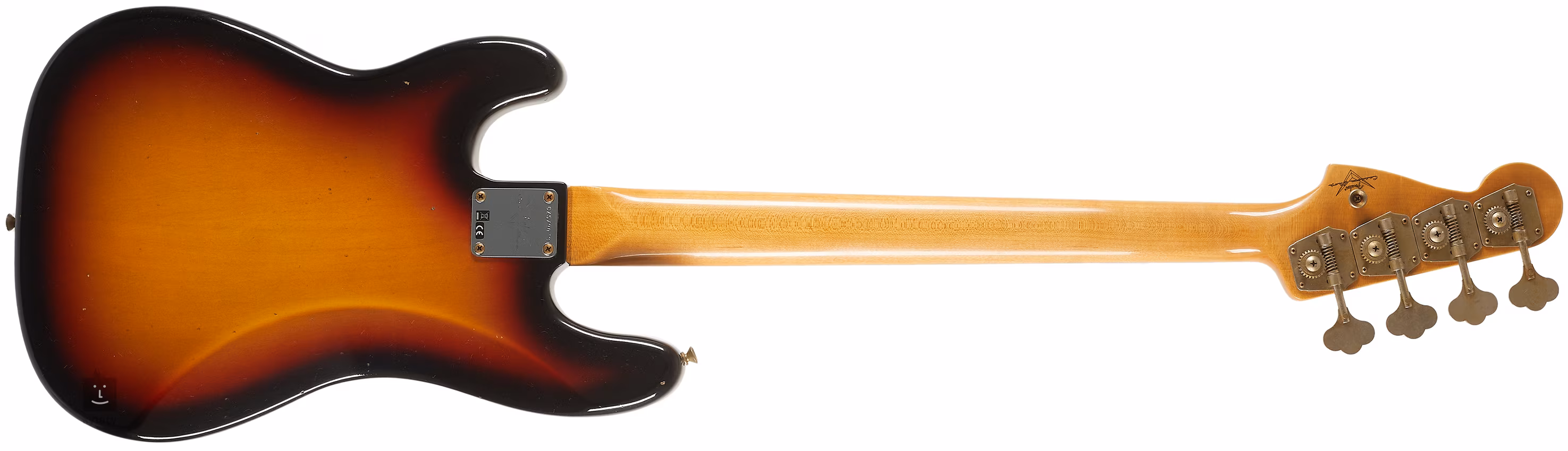Le corps de la basse est fabriqué à partir de deux pièces d'aulne. La finition Sunburst 3 couleurs de la Journeyman Relic offre des éléments de fausse patine qui correspondent à des décennies d'utilisation courante, plutôt domestique. Un manche en érable (scié sur quartier) avec un profil ovale en "C" de 1960 est collé à une touche en palissandre de qualité 3A dotée de vingt frettes Medium Jumbo (6150). L'orientation sur la touche est facilitée par des points de positionnement en nacre.