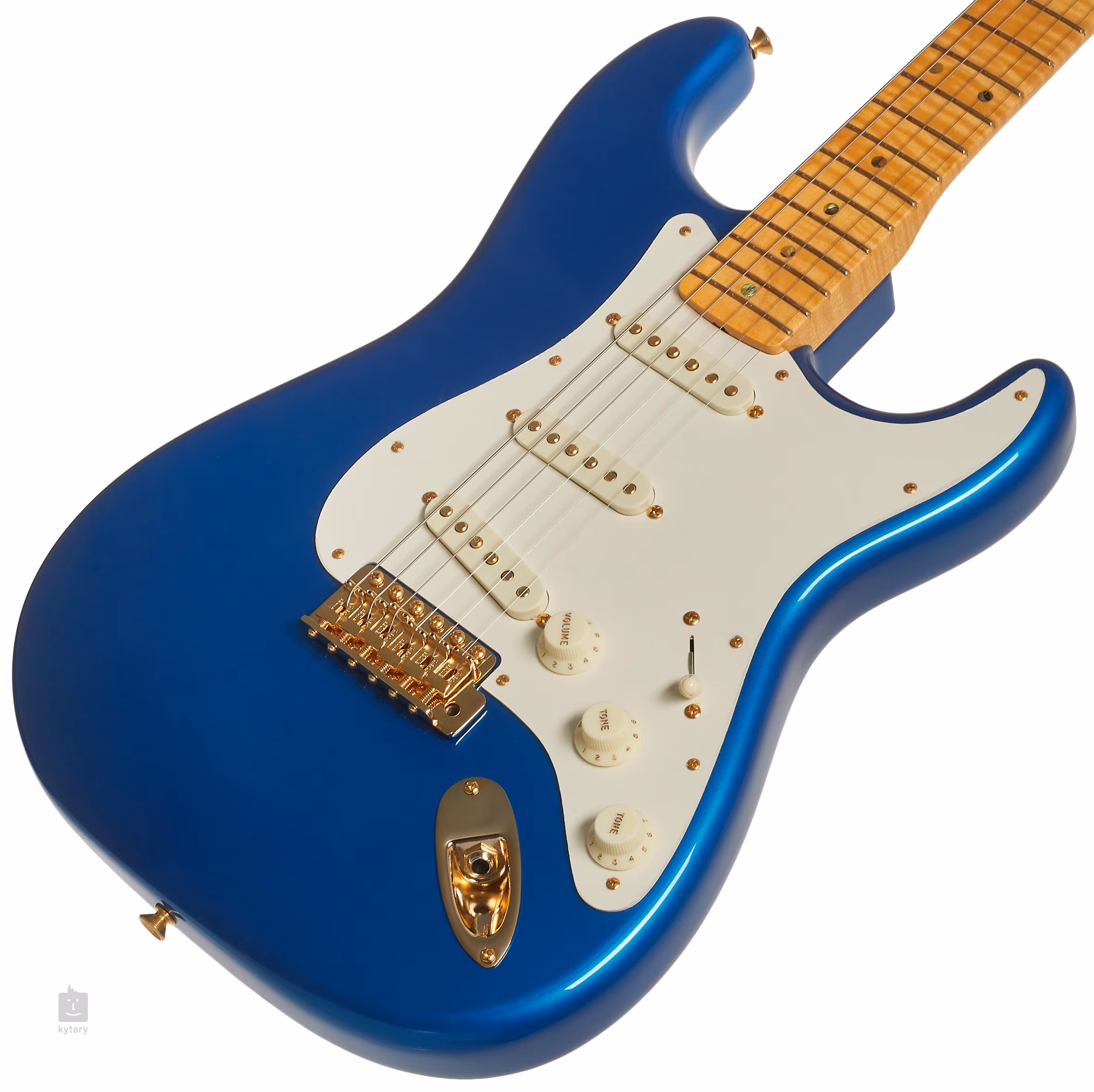 Le corps de la 70th Anniversary Strat NOS with Gold Hardware Bright Sapphire Metallic est fabriqué à partir de deux pièces d'aulne soigneusement sélectionnées. Il s'agit d'un instrument fabriqué selon des spécifications similaires à celles des modèles originaux des années 1950, y compris la finition NOS (New Old Stock), qui est une finition authentique entièrement nouvelle des originaux des années 1950 et 1960, sans la patine artificielle et les éléments de vieillissement de la laque décolorée. Et puis, il est impossible de remonter le temps !