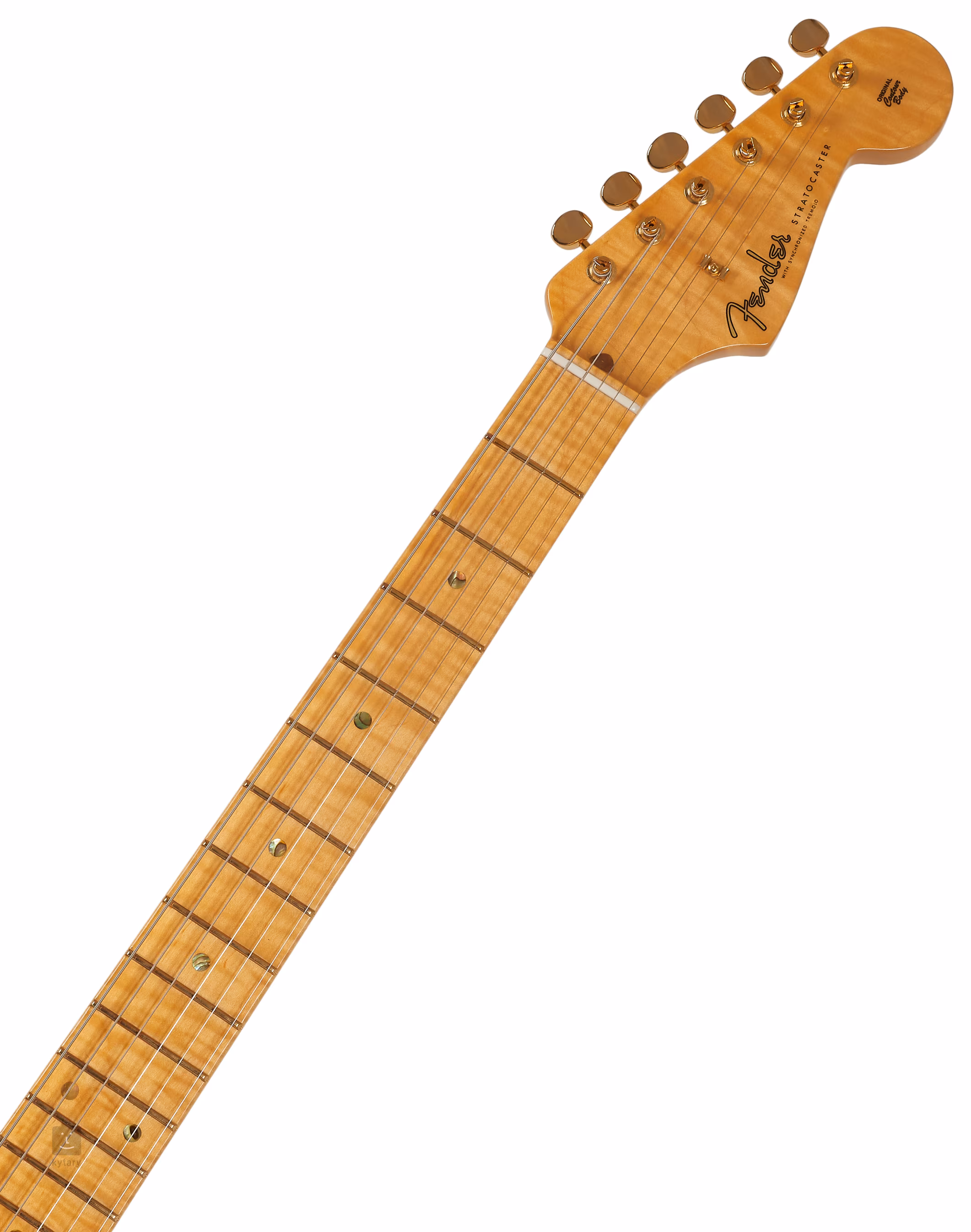 Le manche, fabriqué en une seule pièce d'érable ondé de qualité 4A, offre un profil en "V" souple 10/'56, large mais confortable. La touche est équipée de 21 frettes Medium Vintage (47095) en or et l'orientation sur la touche est facilitée par des points de positionnement en perle (Abalone).