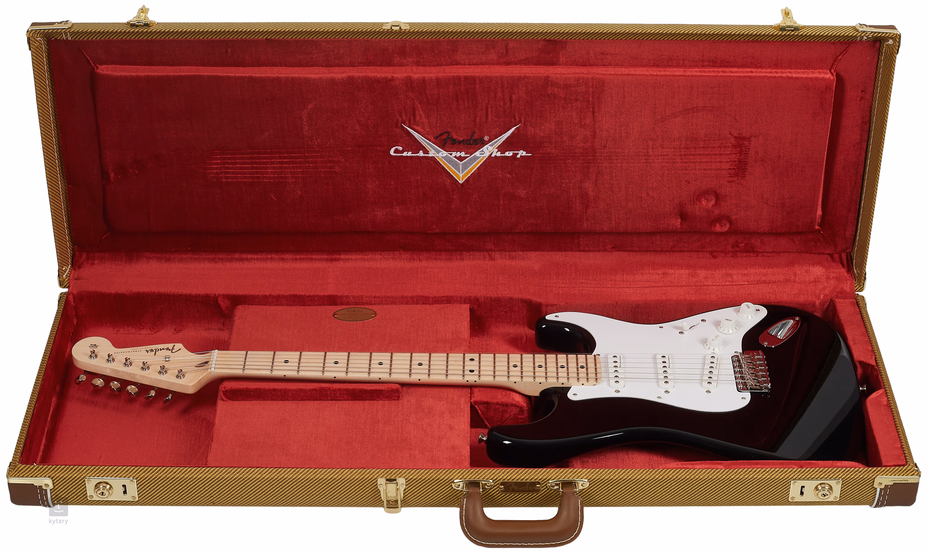 Built to Clapton's specs, the Custom Shop Eric Clapton Signature Stratocaster® guitar features an alder body, special soft V-shaped maple neck, three Vintage Noiseless™ pickups, blocked tremolo and Clapton's signature on the headstock.