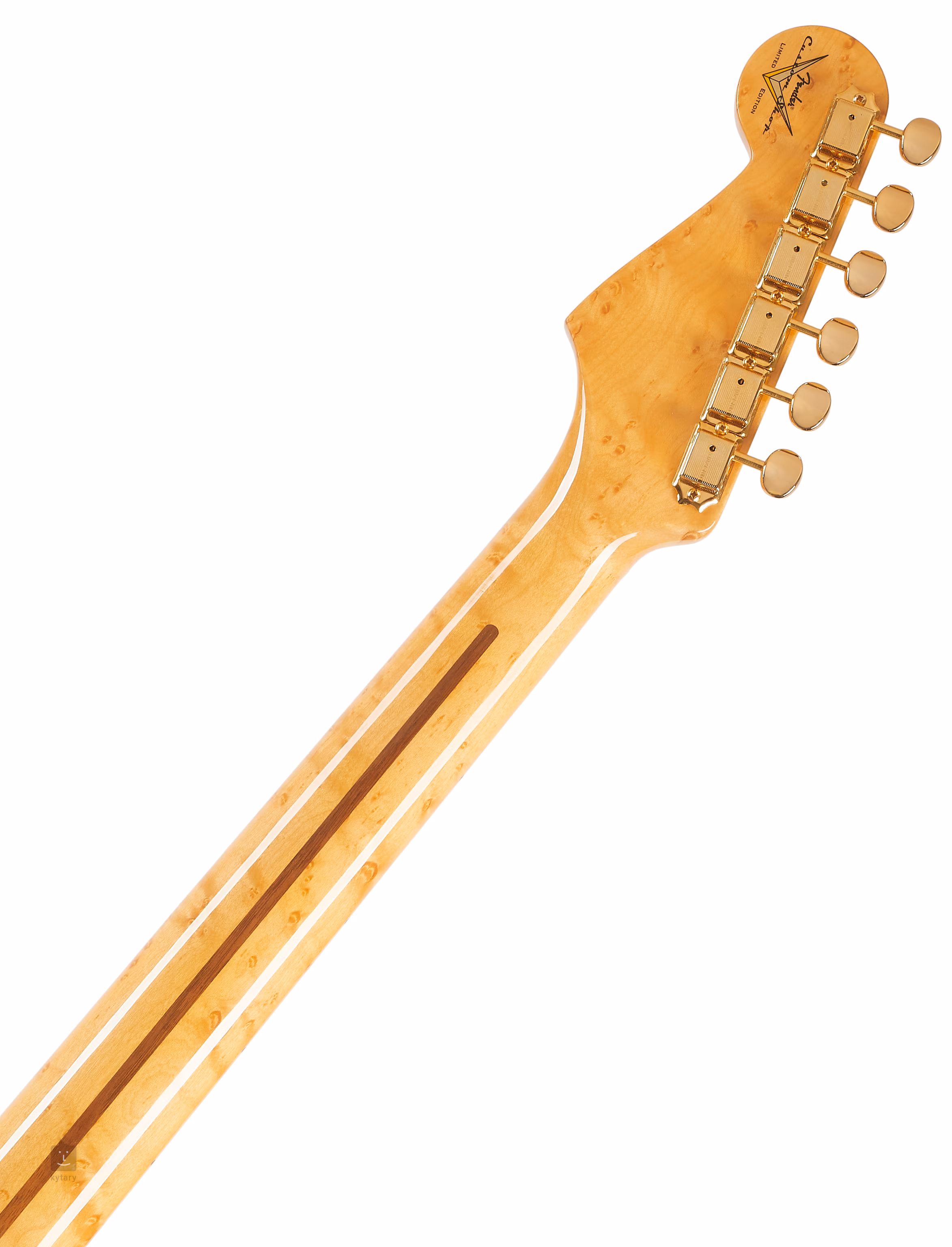 Le corps de cette Stratocaster est fabriqué à partir de deux pièces d'aulne. Le manche et la touche sont en érable Birdseye de qualité AAA, et l'orientation de la surface de la touche est facilitée par des points de positionnement avant et latéraux en micarta. Les trois micros Fat '50s Strat à simple bobinage, dont celui du milieu a une polarité et des bobinages inversés, procurent un son et une sensation identiques. Le circuit Vintage Modified #2 avec Tone-Saver Bleed assure une qualité sonore constante lorsque l'on manipule le potentiomètre de volume. Les cordes sont ancrées par un zéro de frette en os dans des mécaniques de style vintage et un trémolo Strat synchronisé. La finition élégante est accentuée par un accastillage doré et un pickguard Eggshell simple couche.
