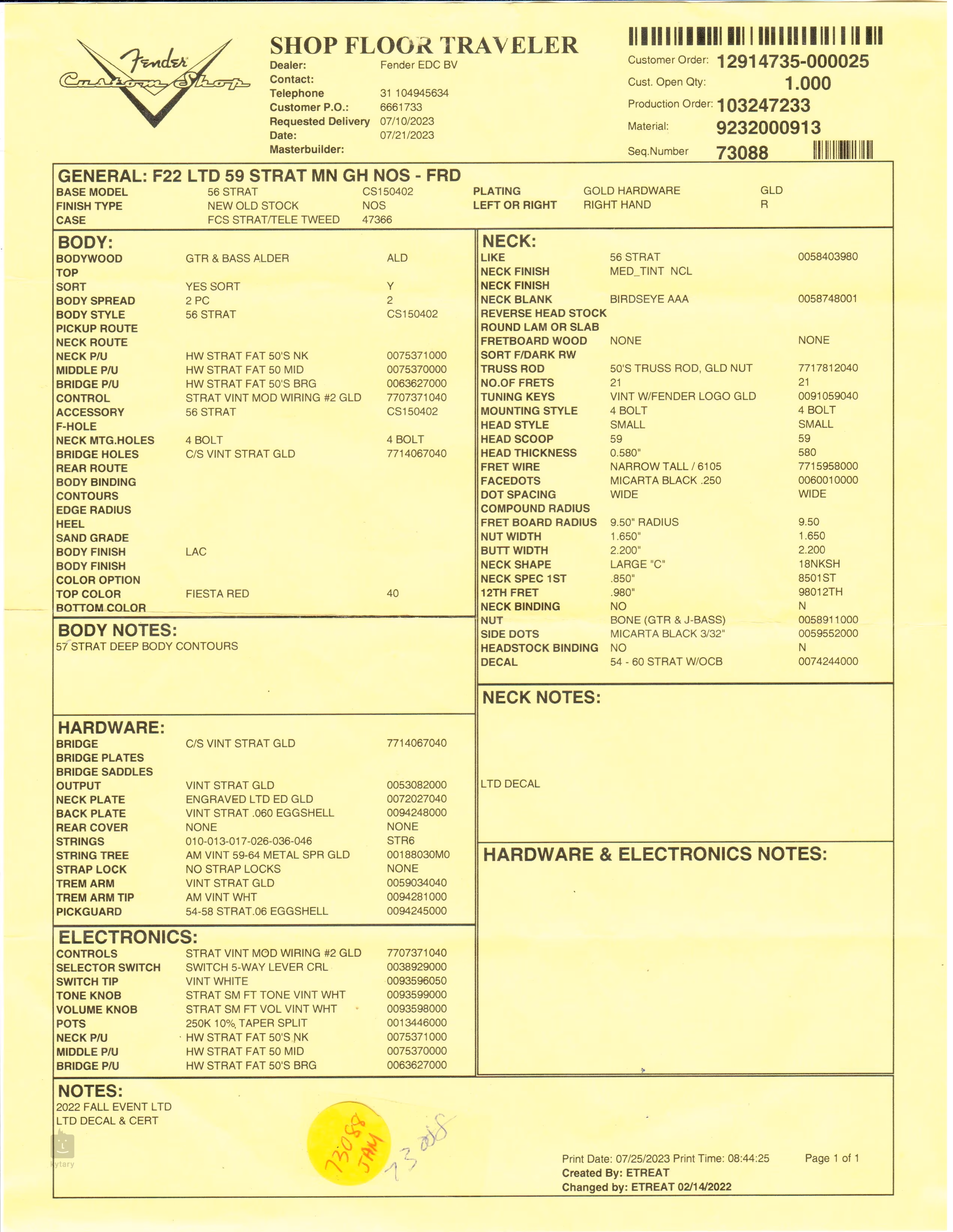 Fender Custom Shop Limited Edition 59 Strat NOS Gold Hardware Fiesta Red