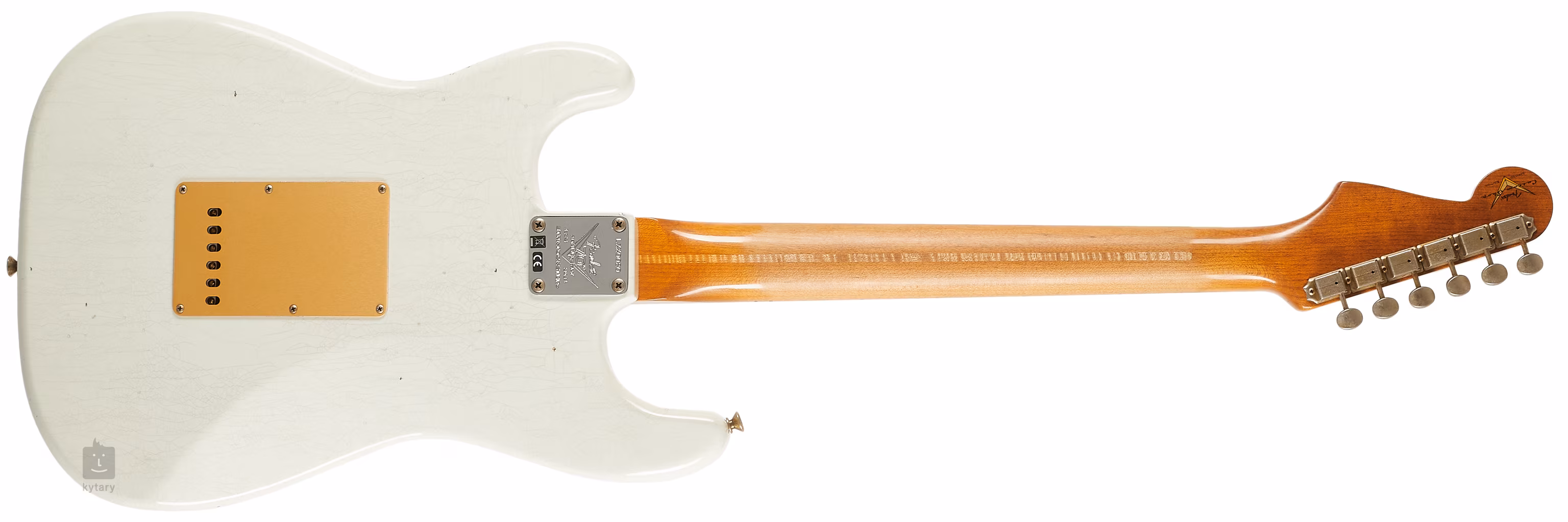 Trois micros du Custom Shop ('54 Strat) montés à la main s'occupent du son de la guitare. Le caractère du son peut être manipulé à l'aide des potentiomètres de volume, de l'obturateur de tonalité et du commutateur de micro à cinq positions. Les cordes sont maintenues dans des mécaniques de style vintage par une touche en os et un trémolo synchronisé Custom Shop. Le style est accentué par le pickguard anodisé or, les couvercles de micros et de potentiomètres ('54 Strat ABS White) et la plaque de manche 70th Anniversary Strat.