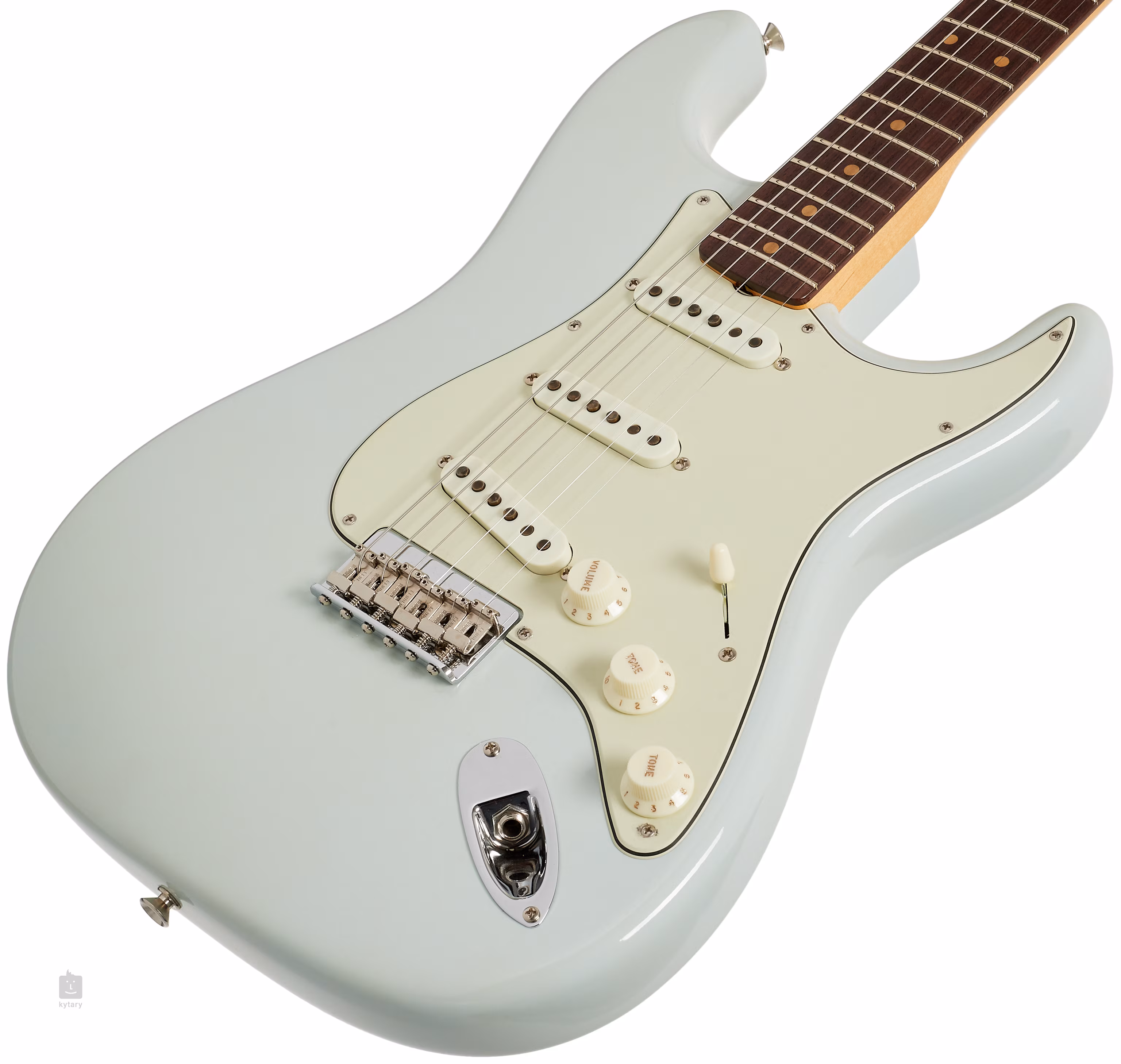 La Fender Vintage Custom '59 Hardtail Strat Time Capsule Package Faded Aged Sonic Blue est un instrument unique issu du Fender Custom Shop. Outre les changements de design apportés par l'année 1959 (touche en palissandre équipée de repères de position en fibre vulcanisée appelés "clay dots", pickguard vert menthe à trois couches fixé par huit, neuf ou dix vis selon le mois de fabrication), elle se distingue des modèles Strat habituels par sa tête massive string-through, ce qui accroît également sa valeur de collection.