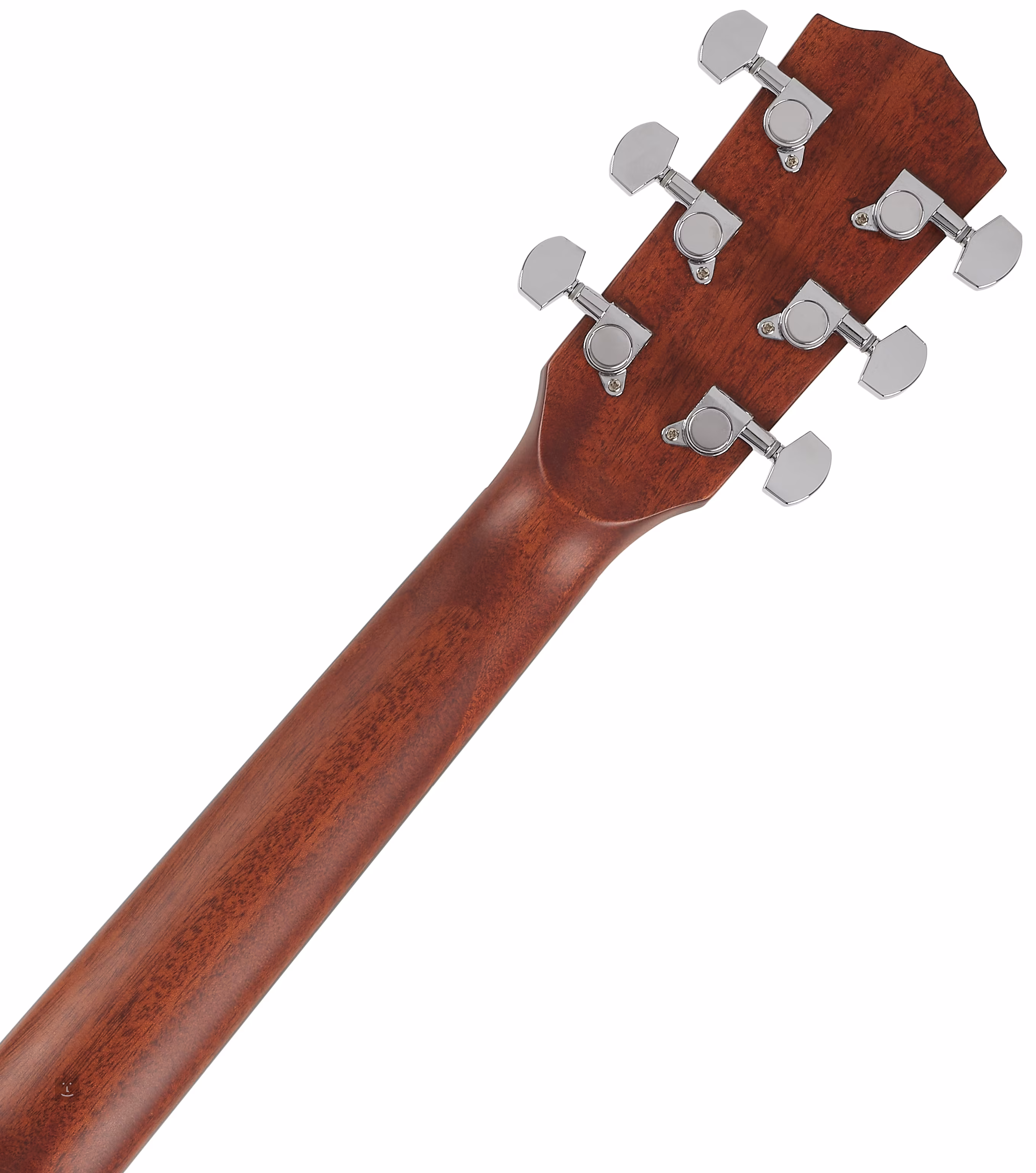 La FA-15 3/4 est une guitare acoustique trois quarts abordable avec un gabarit plus court (592 mm) et un design austere convenant aux débutants. Il présente un corps stratifié composé d'une table en agathis laminé et d'un fond et de côtés en sapelli laminé. Une touche en noyer équipée de dix-huit frettes est collée sur le manche en nato. L'orientation autour de sa surface est facilitée par des points de position blancs.
