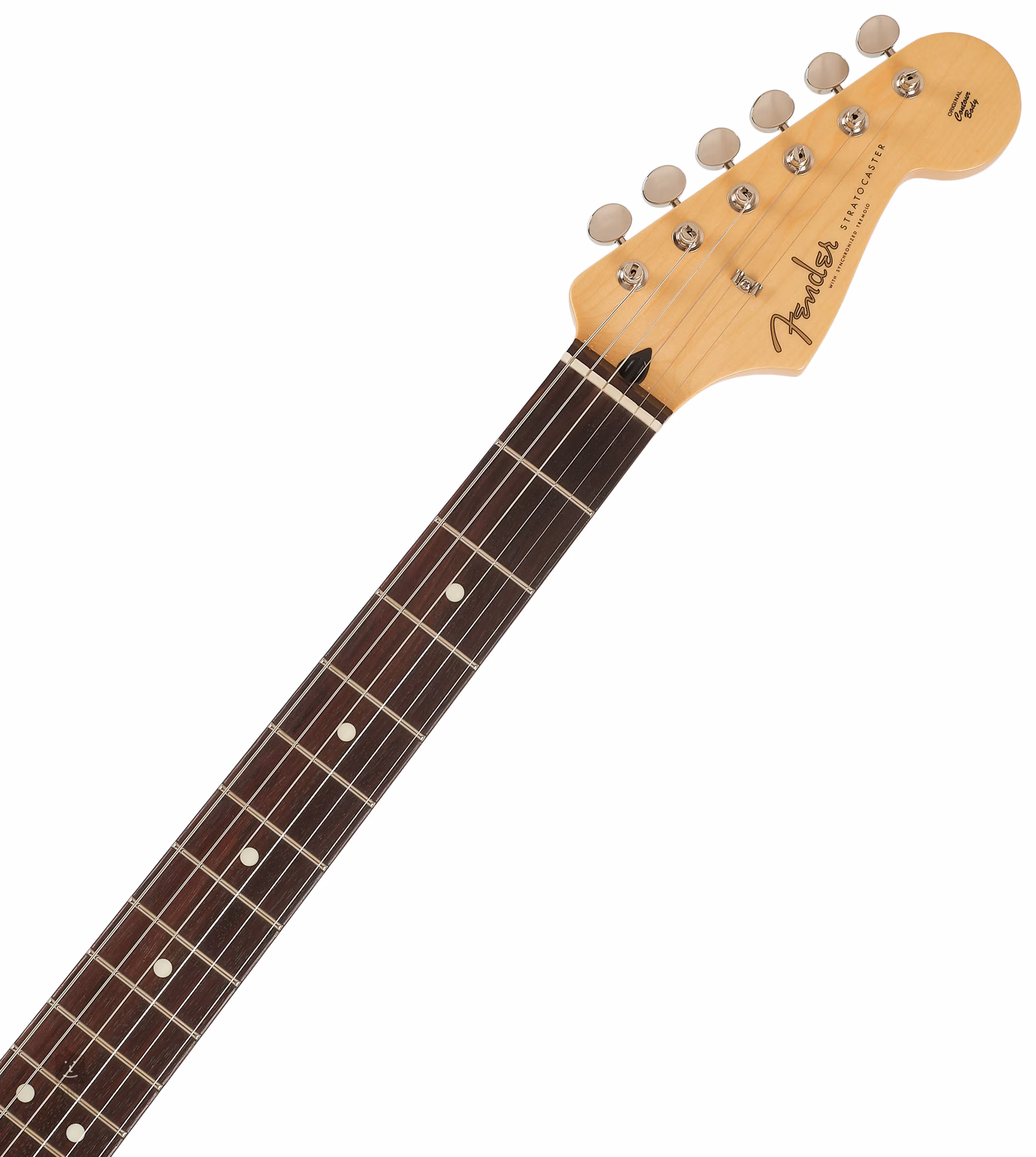 Trois micros à simple bobinage personnalisés se chargent du système sonore de la guitare. Le caractère sonore peut être ajusté à l'aide des potentiomètres de volume, de l'obturateur de tonalité et du sélecteur de micros à cinq positions. Les cordes sont maintenues par des diapasons de style vintage et un trémolo synchronisé. La finition élégante est accentuée par un accastillage chromé et un pickguard à trois couches en vert menthe.