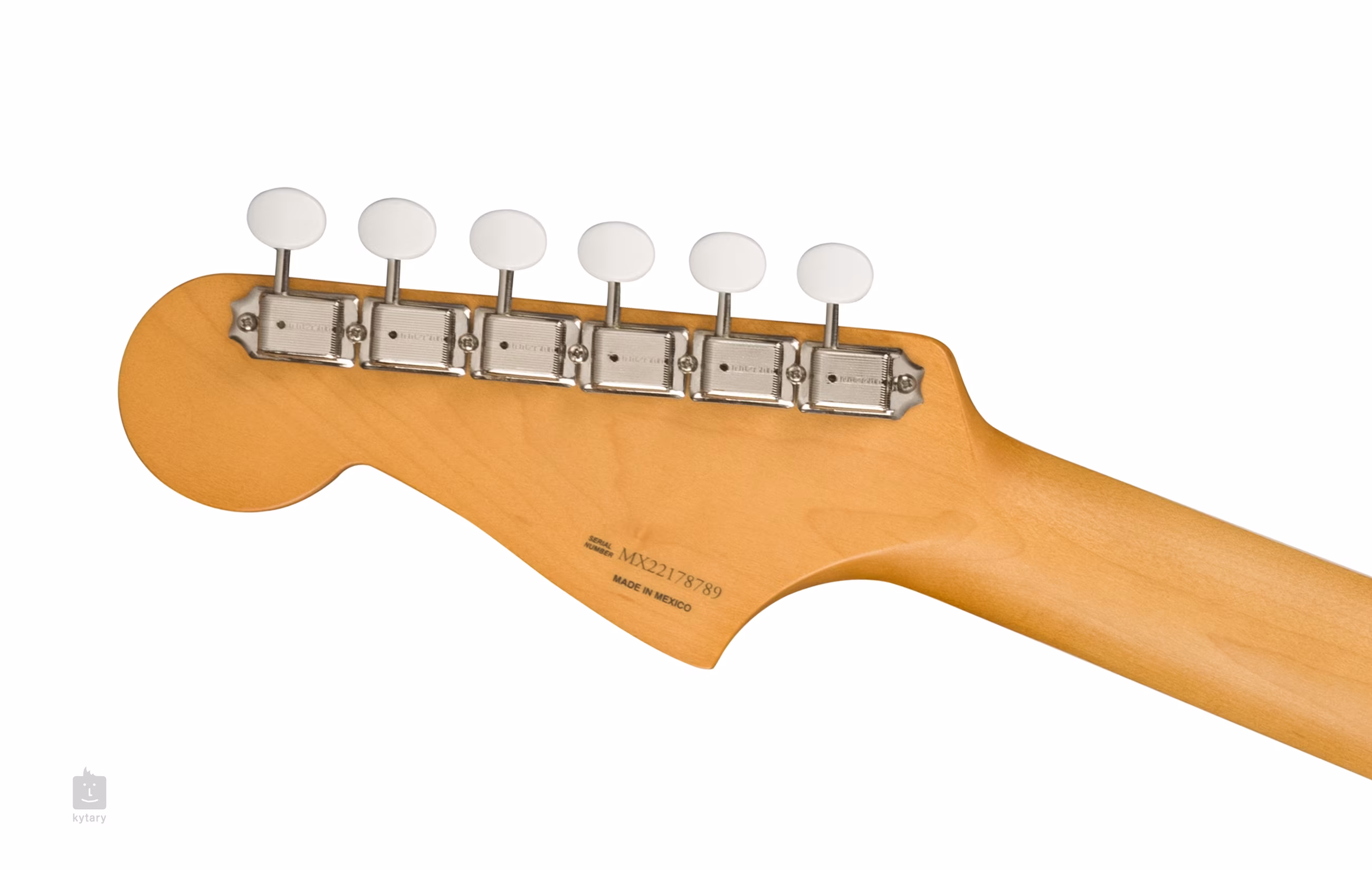 Trois mini humbuckers Gold Foil confèrent à la guitare un son et une sensation Fender authentiques. Les potentiomètres de volume et de tonalité permettent d'ajuster le caractère de la guitare et les trois interrupteurs On/Off permettent d'activer les différents micros. Les cordes sont ancrées par des mécaniques de style vintage et un trémolo Bigsby B50 sous licence. La finition élégante est accentuée par la couleur choisie, le pickguard imitation écaille de tortue et le logo de l'entreprise sur la tête de manche typique de Fender.