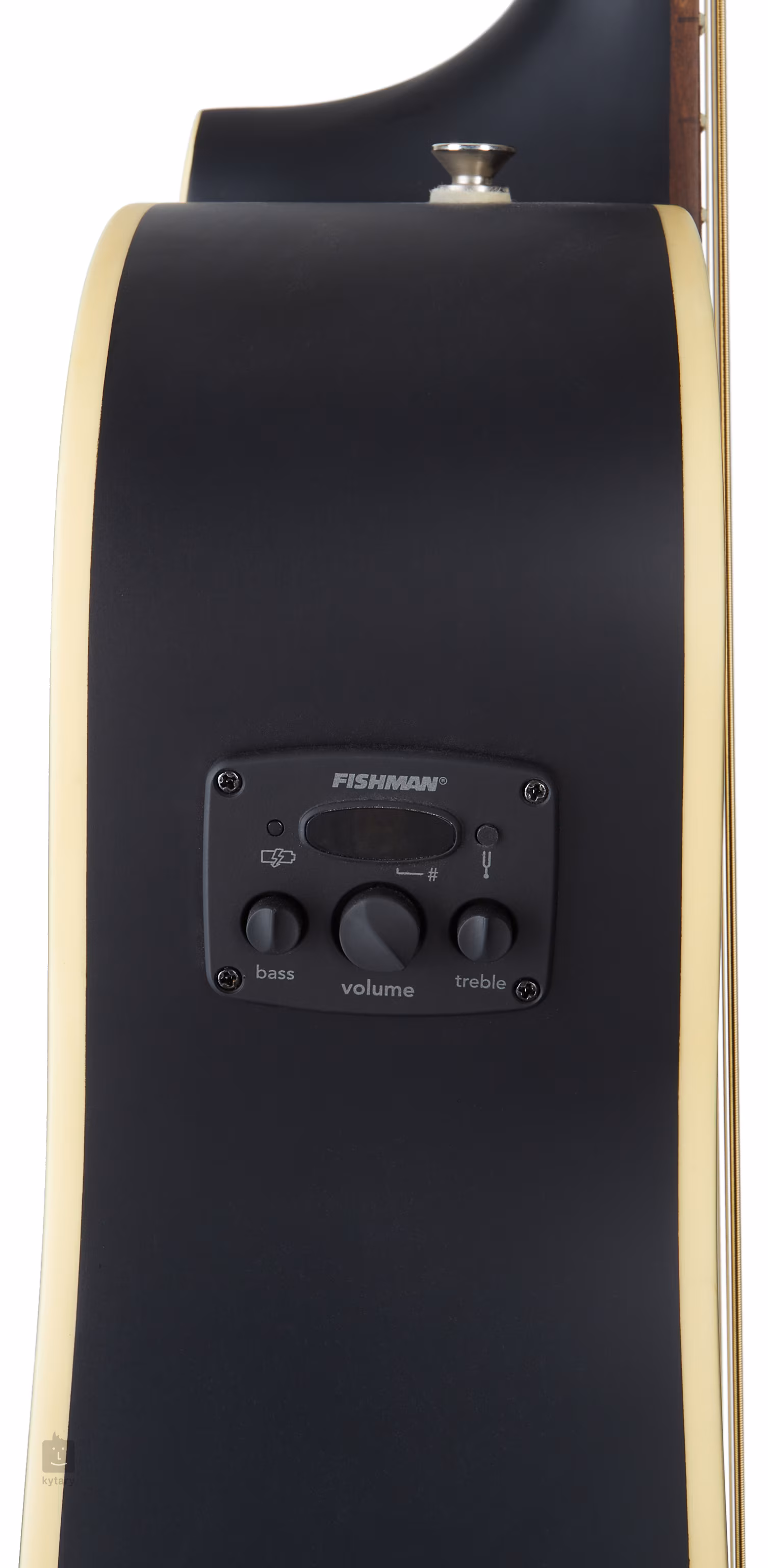 La guitare est équipée de l'électronique Fishman avec des tuners intégrés qui ne dégradent pas le son acoustique naturel de l'instrument. La stabilité de l'accord et le bon sustain sont garantis par la fixation des cordes a travers le zéro et les frettes du sillet en matériau GrapthTech NuBone en mécanique nickel et en noyer Tete en forme de Viking moderne. La belle finition est accentuée par le binding double face du corps en blanc vieilli et la signature a l'arriere de la poupée.