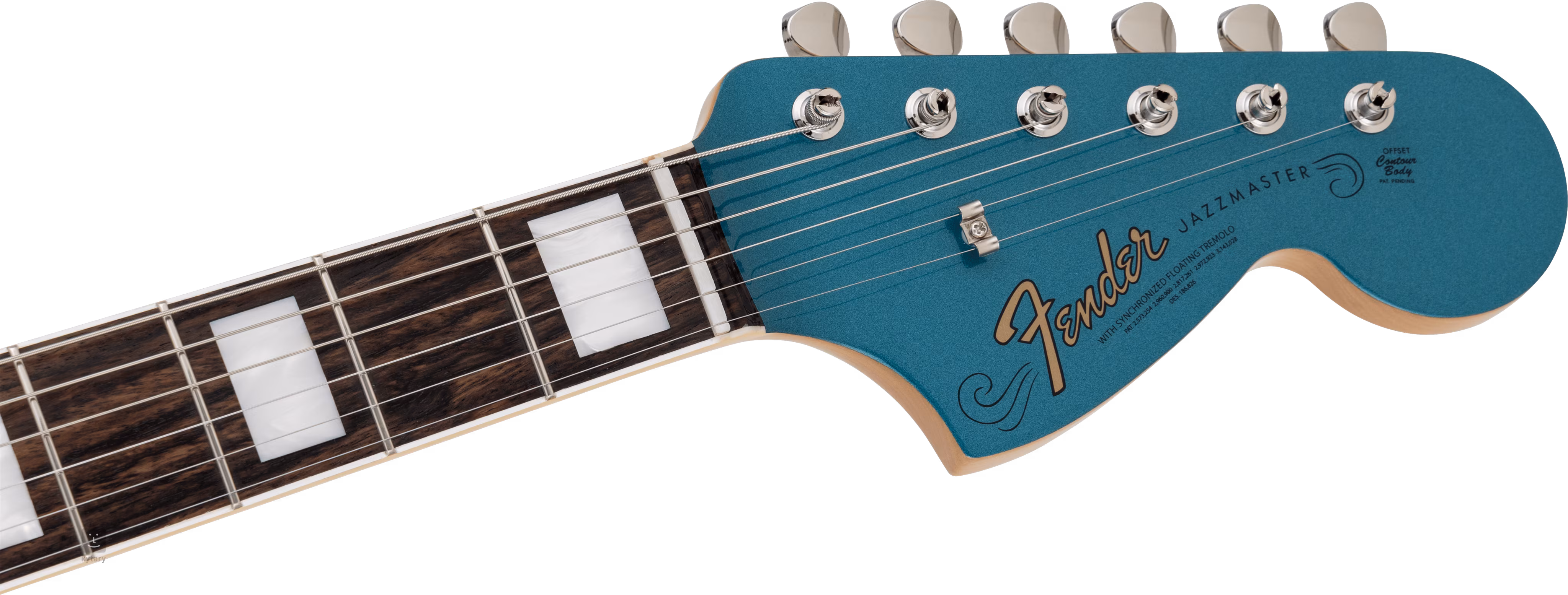 Le mot Jazzmaster dans le nom indique l'intention originale, mais cet instrument, avec sa forme de corps décalée typique, n'a pas vraiment été associé au jazz - il a gagné en popularité parmi les musiciens de la scène musicale alternative (du surf rock à l'indie rock). Le corps en tilleul de l'instrument est décoré d'une laque polyester brillante et d'une finition Ocean Turquoise Metallic. Un manche en érable avec un profil en "U" est collé à une touche en palissandre munie de 21 frettes de taille vintage. L'orientation de la touche est facilitée par des blocs de position en imitation de nacre.