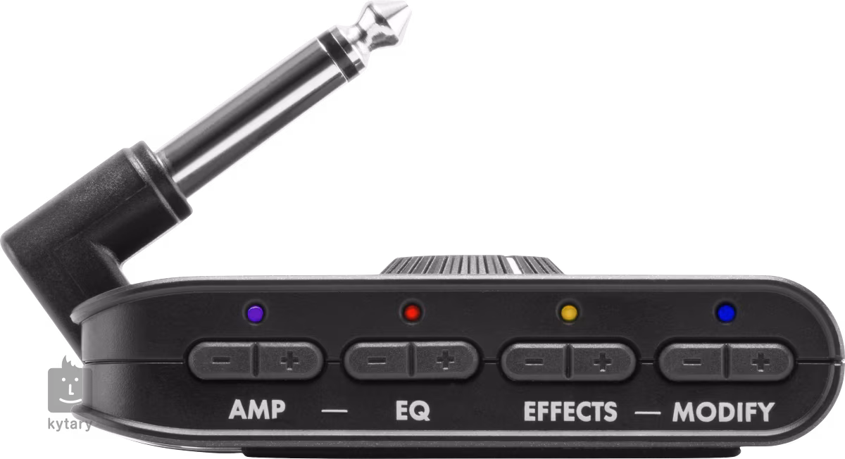 Sur le côté de l'amplificateur, vous trouverez quatre commandes. L'ampli vous permet de choisir parmi douze modèles, dont quatre modèles au son clair, trois modèles subtilement déformés avec un son distordu (Crunch), quatre machines à gain élevé correctement surmultipliées (High-Gain) et un préampli de studio au son non coloré (Direct). L'égaliseur permet de régler les caractéristiques tonales de l'ampli, la commande Effects permet de choisir entre plusieurs types de réverbération et des combinaisons d'effets tels que chorus, delay et tremolo, et la commande Modify permet de régler divers paramètres pour les effets individuels. Vous pouvez régler le volume à l'aide du potentiomètre de volume situé à l'avant de l'appareil.