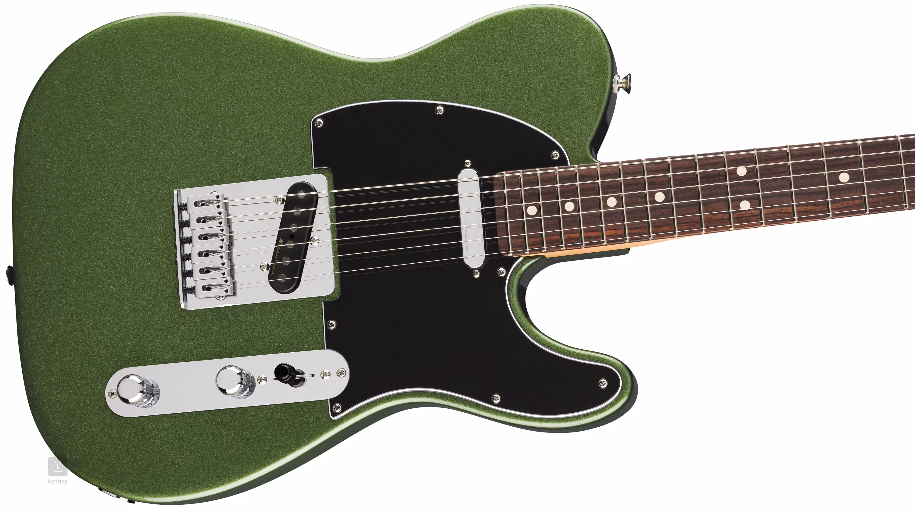 Une autre nouveauté de la gamme est l'utilisation d'accordeurs Fender Sealed Locking et d'une touche TusQ (la gamme standard a une touche en faux os). Les cordes sont ancrées dans une tête Tele string-through avec six sillets en laiton en standard. Le look élégant de la guitare est accentué par un pickguard noir à trois plis et une finition Harvest Green Metallic.