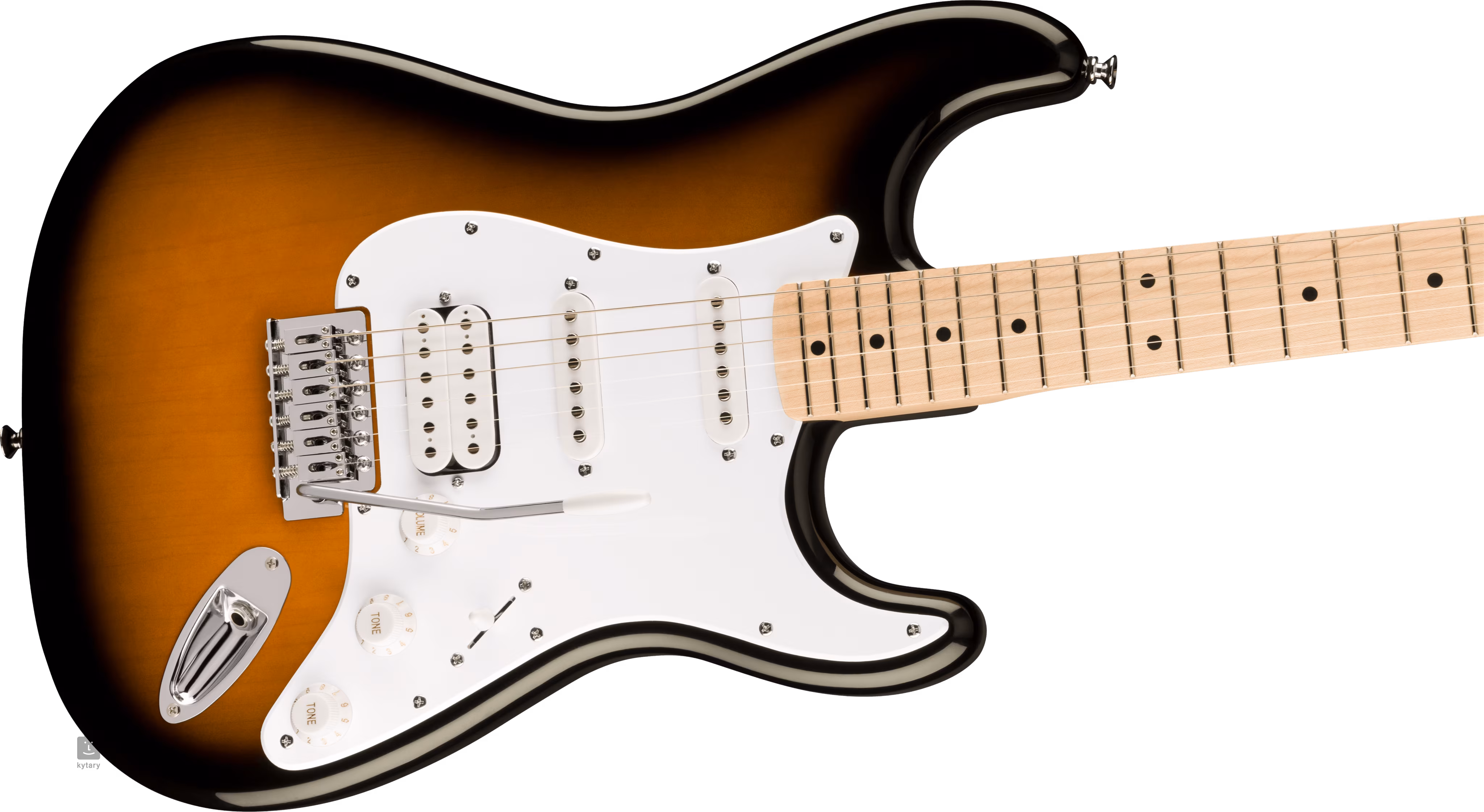 La combinaison d'un micro humbucker cobbler et de deux micros à simple bobinage avec aimants en céramique confère à la guitare le son rock juteux et la sonorité propre des modèles Strat. Les potentiomètres de volume, les deux commandes de tonalité et le commutateur de micro à cinq positions permettent d'ajuster les contours de la guitare. Les cordes sont ancrées dans les mécaniques moulées sous pression et le trémolo synchronisé de l'entreprise. Le design élégant de la Strat est accentué par un accastillage chromé, un pickguard simple couche blanc et le logo de l'entreprise sur la tête de manche.