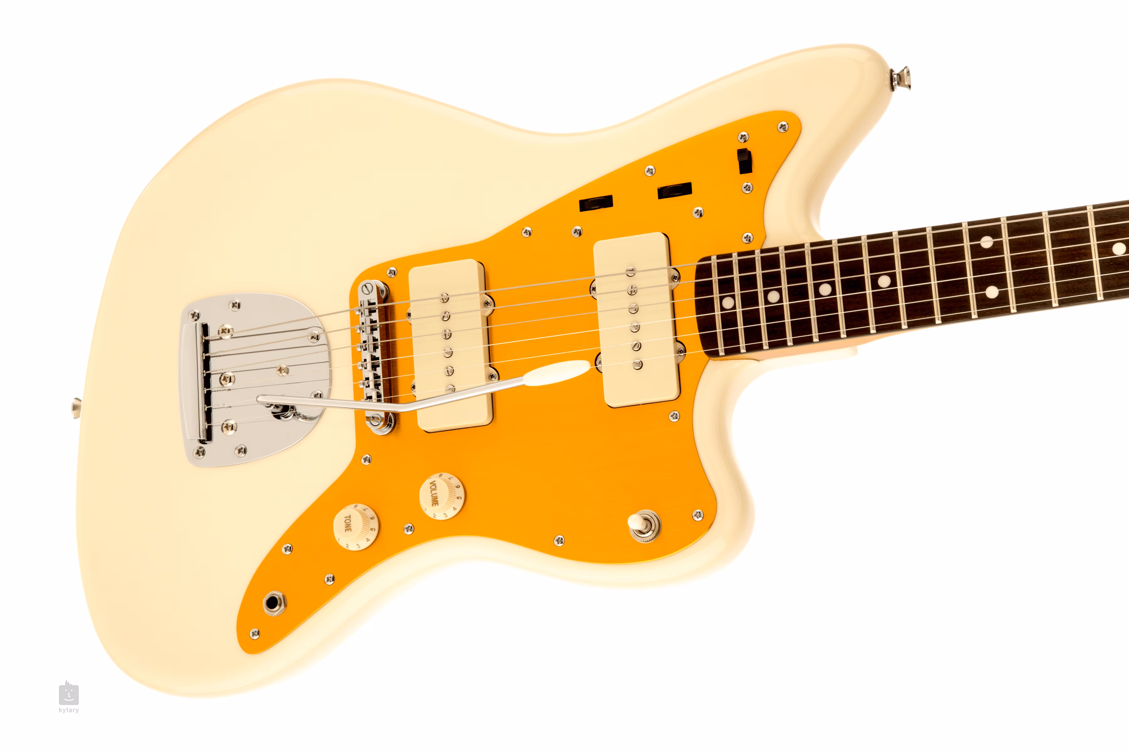 Le corps en tilleul de la guitare est orné d'une finition brillante et d'une couleur Vintage White. Le manche en érable au profil en C confortable est surmonté d'une touche en figue dotée de 21 frettes géantes et de points de positionnement blancs. Les cordes sont montées sur des mécaniques de style vintage et sur une touche Adjusto-Matic dans un trémolo flottant traditionnel de la Jazzmaster. Le style est accentué par le pickguard en aluminium anodisé et le logo Fender Squier Jazzmaster sur la tête.