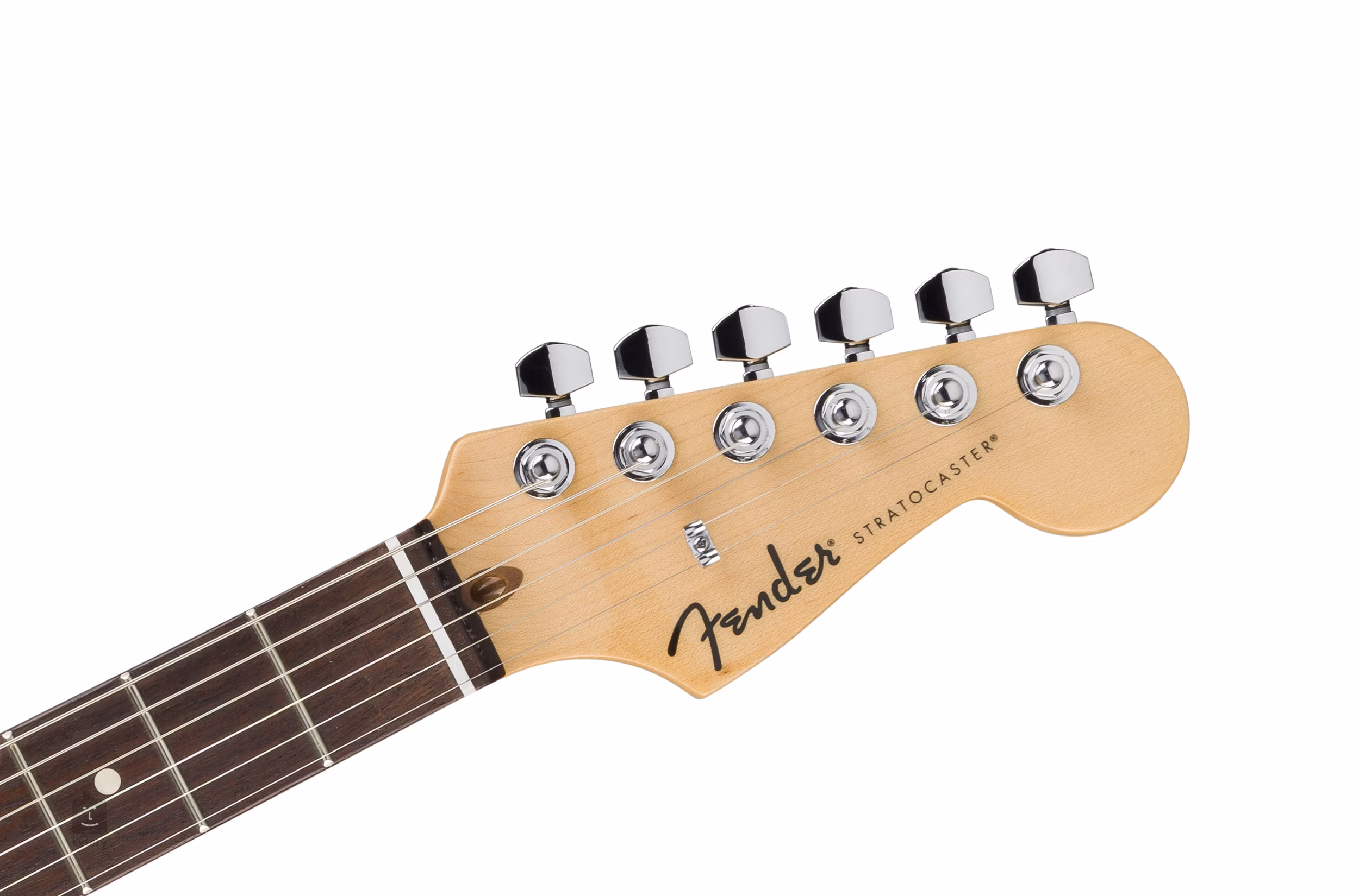 Un micro humbucker à bobine et deux micros à simple bobinage avec des aimants en céramique et un rendement légèrement plus élevé confèrent à la guitare un son rock juteux et un son magnifiquement propre. Les potentiomètres de volume, les deux commandes de tonalité et le commutateur de micro à cinq positions permettent d'ajuster les contours de la guitare. Les cordes sont montées dans les mécaniques de l'entreprise (Fender Standard Cast) et le trémolo à 2 points avec des sillets en acier chromé (block saddles). La finition élégante est accentuée par un pickguard blanc à trois couches et le logo Fender Stratocaster sur la tête de la guitare.