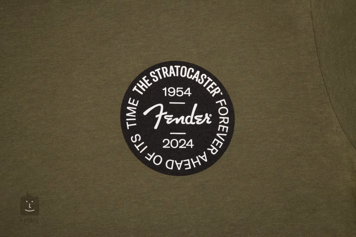 Le Strat 70th Badge Tee T-shirt en coton olive avec badge d'anniversaire imprimé sur la poitrine gauche commémore le 70e anniversaire de la guitare électrique Fender Stratocaster. Ce tee-shirt est disponible en plusieurs tailles.