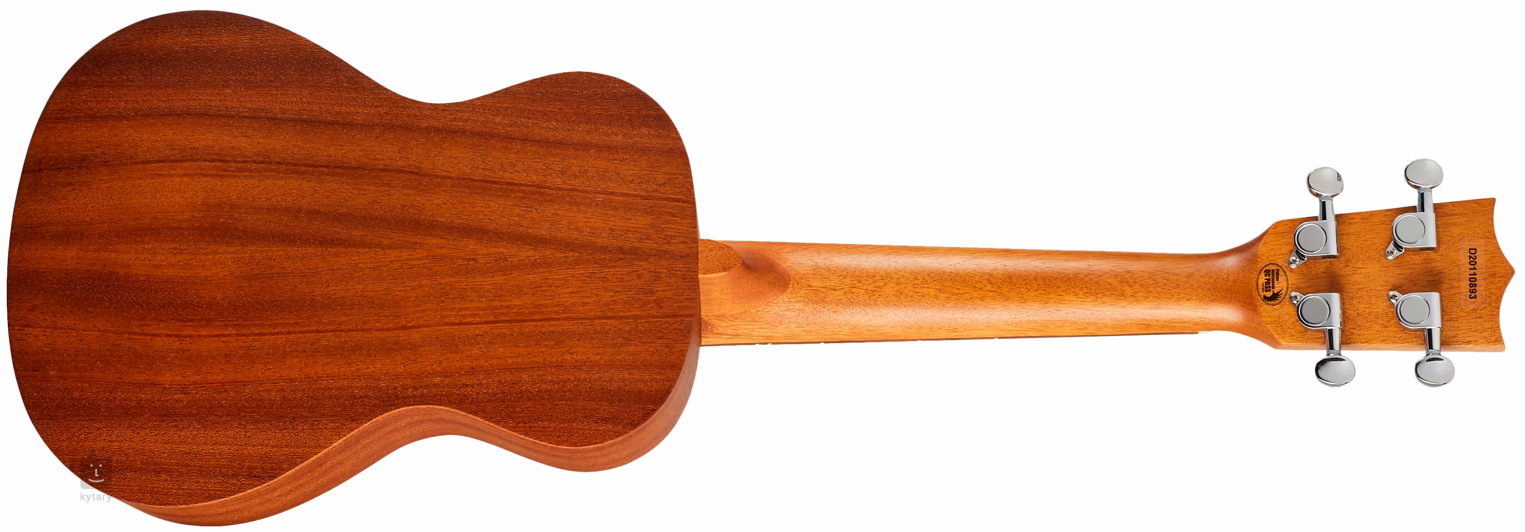 L'avant de cet ukulélé de concert est en épicéa laminé, tandis que le dos et les éclisses sont en acajou laminé. La résonance naturelle de l'ukulélé est renforcée par la plaque arrière légèrement incurvée. Le manche et la touche de l'instrument sont en okoumé africain et en noyer, une combinaison de bois assez courante. Les cordes sont ancrées par une touche en os et un sillet de chevalet dans des mécaniques à engrenages et une touche en noyer.