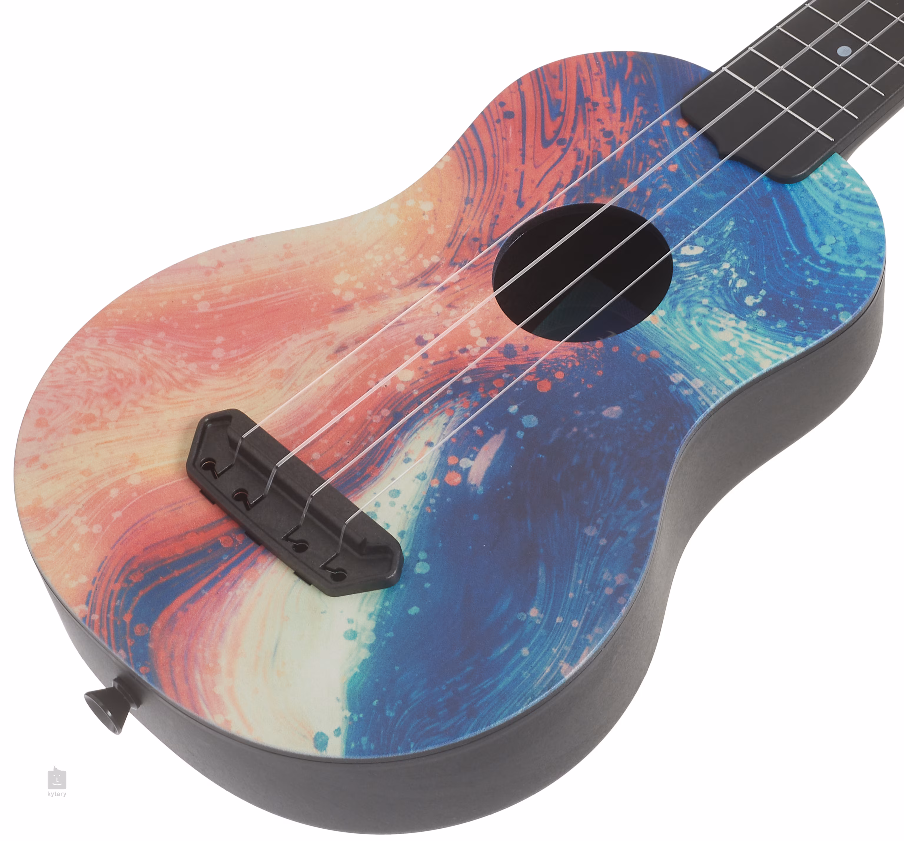 Les cordes sont ancrées dans des mécanismes d'accordage de type guitare (Geared) et une tête en plastique. Les motifs graphiques/impressions sur la table d'harmonie et la tête soulignent la qualité de la fabrication. En raison de sa construction en plastique durable, l'ukulélé est livré dans un étui/sac à dos à cordon simple. Un livret d'instructions est inclus.