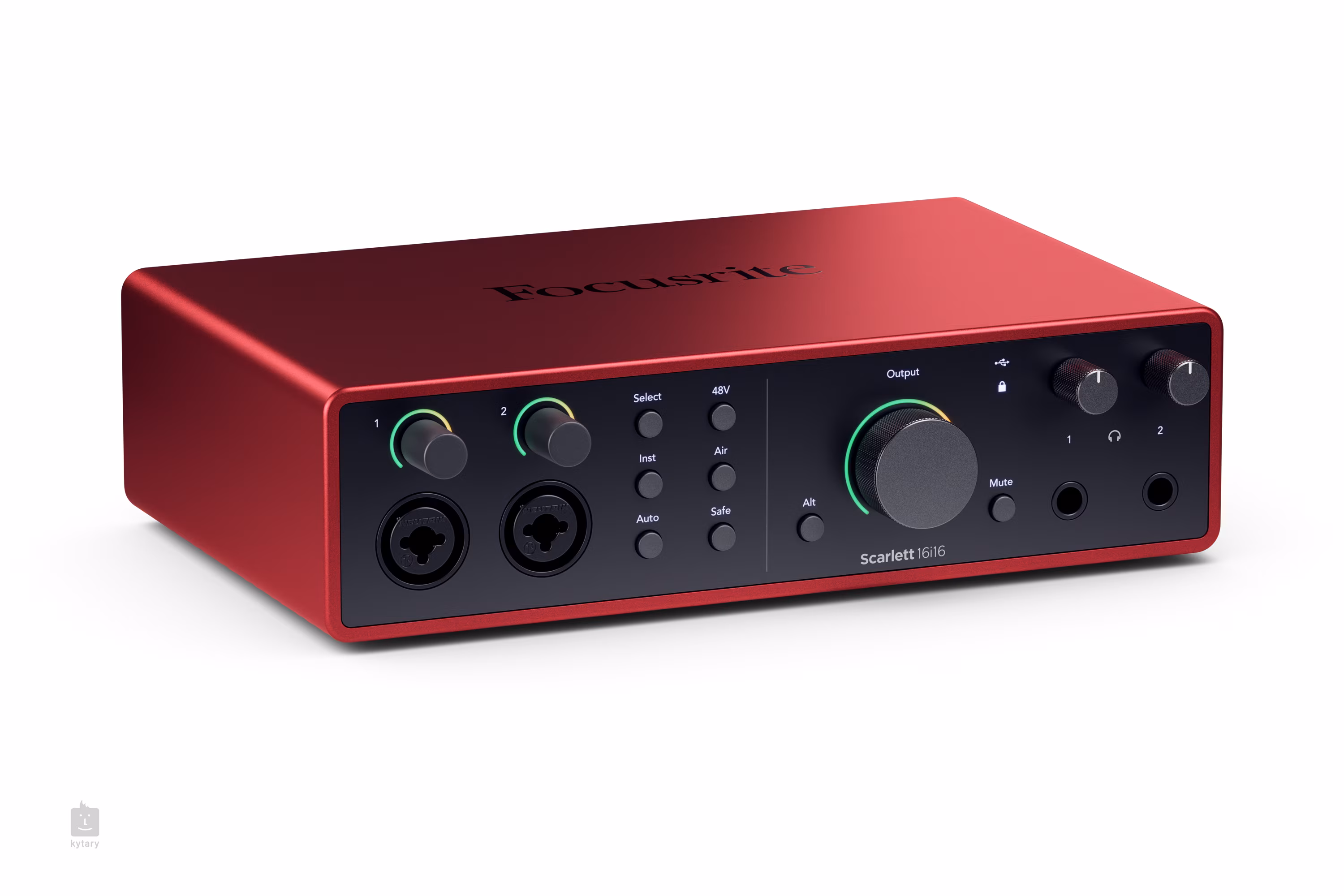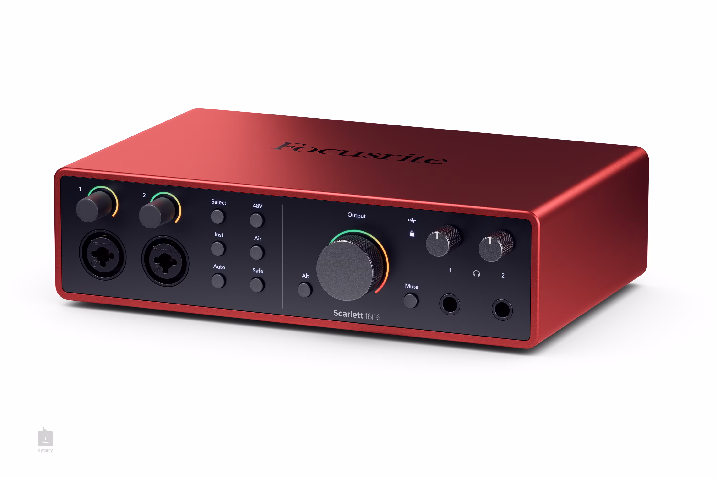Focusrite Scarlett 16i16 4e génération est une interface audio USB-C avec 16 canaux d'entrée et 16 canaux de sortie. La section analogique se compose de 2 entrées combo principales pour les signaux de microphone, de ligne ou d'instrument, et 4 autres entrées de ligne sont disponibles sur le panneau arrière. La sortie analogique comprend 4 canaux et permet de connecter deux paires de moniteurs de studio avec la possibilité de les commuter avec le bouton Alt. Il y a également une paire de sorties casque avec réglage individuel du volume, ainsi qu'une interface MIDI complète. Le périphérique numérique dispose d'une interface optique ADAT pour connecter 8 canaux d'entrée et de sortie supplémentaires, ou SPDIF stéréo.