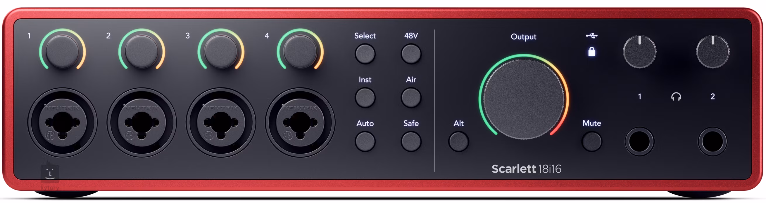 Focusrite Scarlett 18i16 4e génération est une interface audio USB-C avec 18 canaux d'entrée et 16 canaux de sortie. La section analogique se compose de 4 entrées combo principales pour les signaux de microphone, de ligne ou d'instrument, et 4 autres entrées de ligne sont disponibles sur le panneau arrière. La sortie analogique comprend 4 canaux et permet de connecter deux paires de moniteurs de studio, avec la possibilité de les commuter via le bouton Alt. Il y a également une paire de sorties casque avec réglage individuel du volume, ainsi qu'une interface MIDI complète. Le périphérique numérique dispose d'une interface optique ADAT pour connecter 8 canaux d'entrée et de sortie supplémentaires, ou d'une interface stéréo SPDIF.