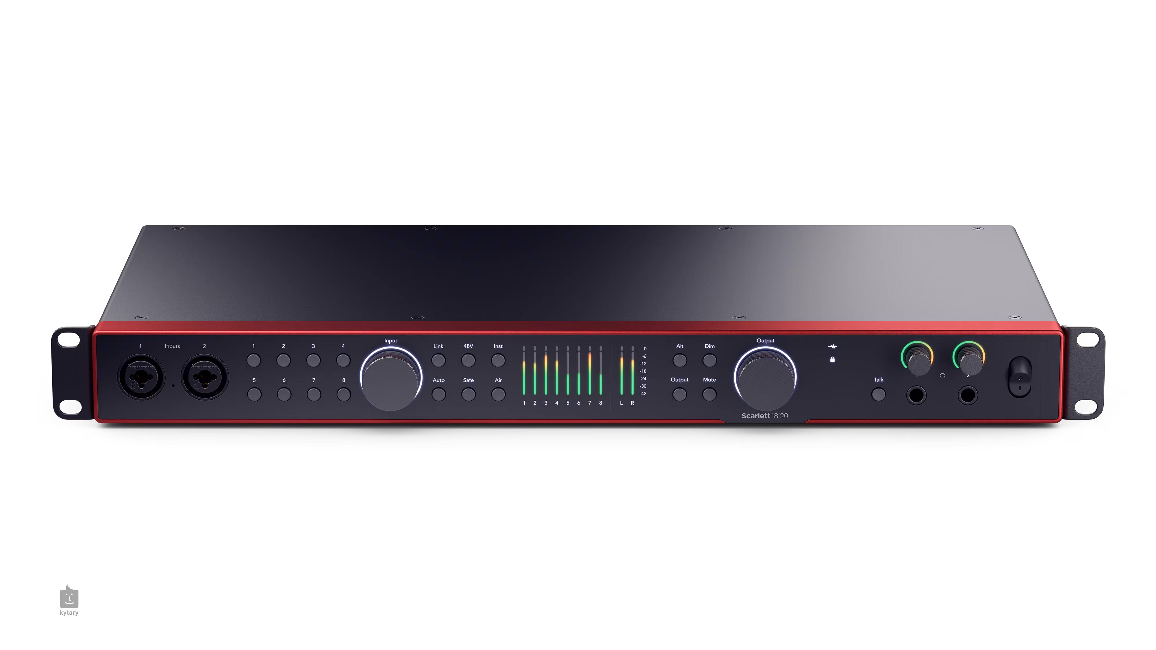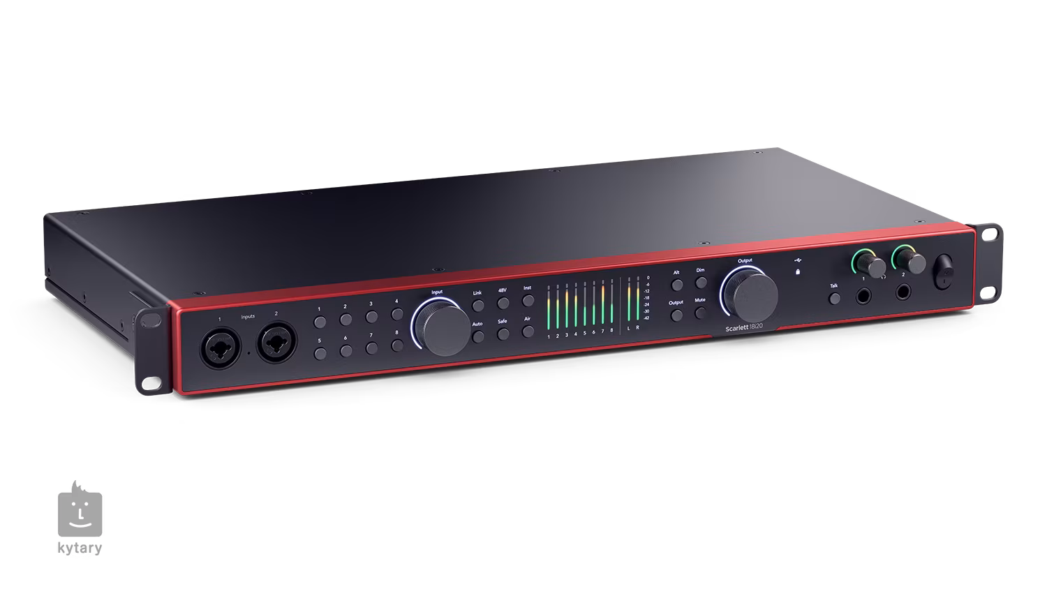 La Focusrite Scarlett 18i20 4e génération est une interface audio USB-C avec 18 canaux d'entrée et 20 canaux de sortie, et constitue le modèle haut de gamme de la gamme Scarlett. La section analogique comprend 10 entrées combinées pour les signaux de microphone, de ligne ou d'instrument. La section de sortie analogique comprend 10 canaux, y compris la connexion de deux paires de moniteurs de studio avec la possibilité de les commuter avec le bouton Alt. Il y a également une paire de sorties casque avec contrôle individuel du volume, ainsi qu'une interface MIDI complète ou un microphone intégré pour TalkBack. Grâce à l'interface E/S ADAT optique divisée en 1 / 2 connecteurs, vous pouvez distribuer le signal à une qualité maximale de 96 kHz (seul le premier connecteur peut être utilisé jusqu'à 48 kHz pour 8 canaux) et ainsi étendre le nombre existant d'entrées et de sorties. La synchronisation parfaite est alors assurée par l'interface Word CLock. Les connecteurs SPDIF sont utilisés pour la connexion numérique stéréo.