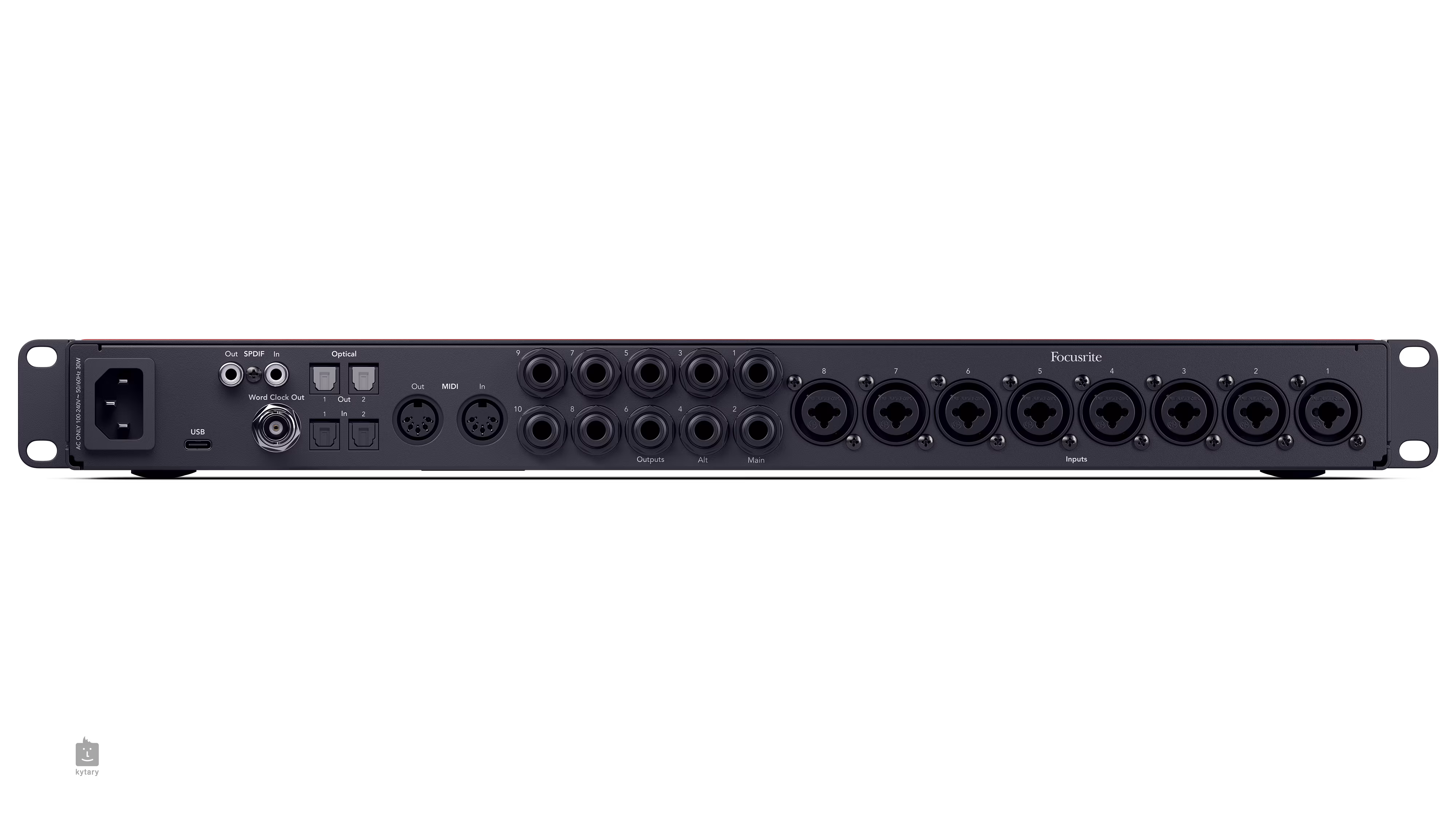 • Sorties 10x Jack 6.3 mm (Line), 2x Jack 6.3 mm (Phones), 2x ADAT (8 channels SMUX), 1x S/PDIF, 5-pin DIN MIDI, 1x BNC WC