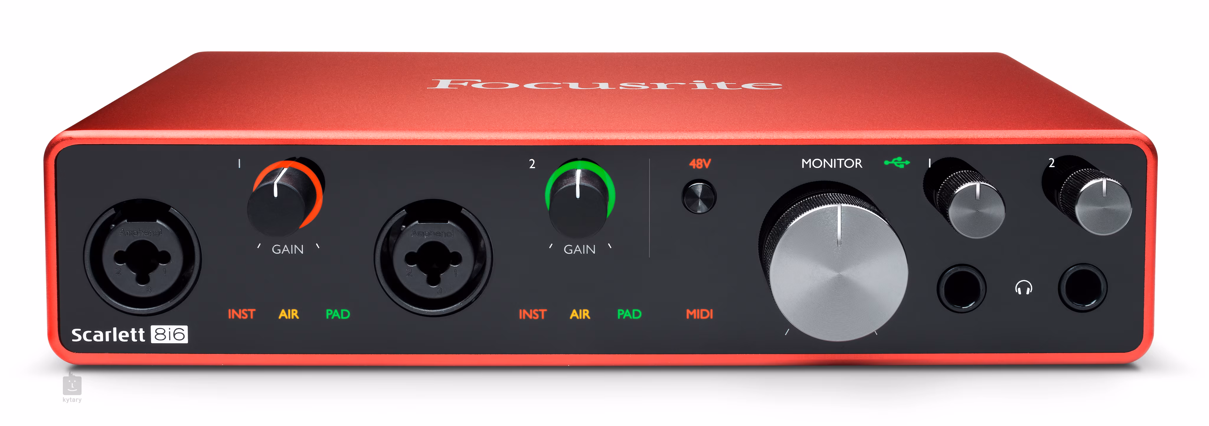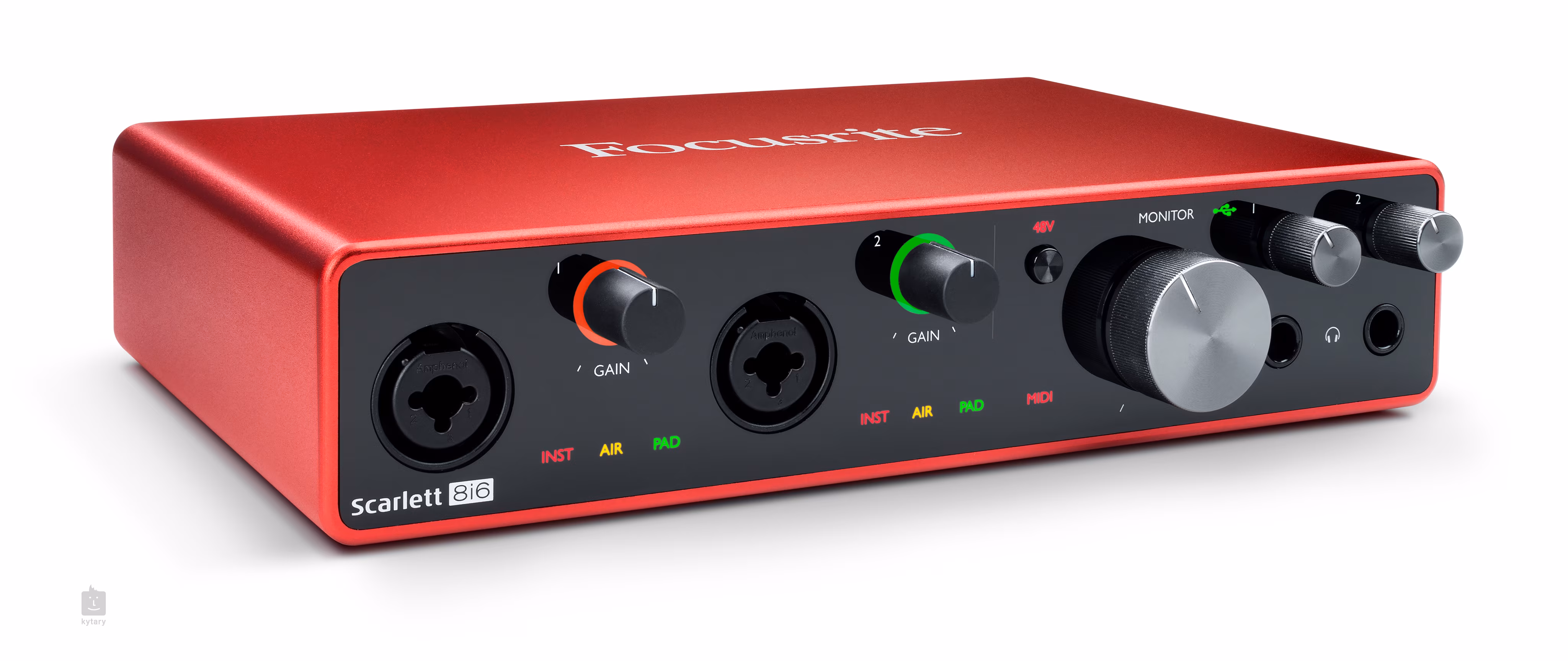 La Scarlett 8i6 est un modèle avancé de la série de cartes son Scarlett de troisième génération. Elle remplace la 6i6 dans la nouvelle série et offre aux producteurs des options de connectivité extrêmes qui leur permettent de garder tout leur matériel branché et prêt à fonctionner à tout moment. La Scarlett 8i6 promet un service entièrement professionnel au-delà des murs du studio d'enregistrement. Grâce à deux entrées combo et quatre entrées ligne, il offre la possibilité d'enregistrer simultanément des instruments et des voix. La présence de connecteurs MIDI et SPDIF étend la connectivité de l'appareil aux synthétiseurs ou aux modules de batterie. Le 8i6 dispose de six entrées ligne et de deux sorties casque avec contrôle de volume séparé. Il offre également des convertisseurs AD/DA de haute qualité capables de travailler avec des résolutions allant jusqu'à 24 -bit/192 kHz ou des préamplis micro avec la fonction AIR mode pour simuler les légendaires préamplis ISA. La troisième génération de Scarlett se caractérise par une distorsion et une latence nettement moindres, un rapport signal/bruit plus élevé ou encore une plus grande marge de manœuvre. La connectivité via USB-C est une nouvelle fonctionnalité.