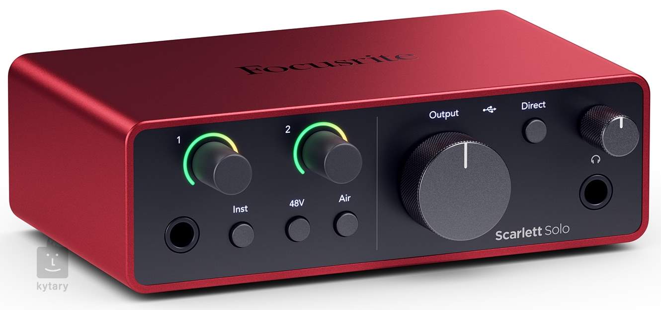 La Focusrite Scarlett Solo 4e génération est une interface audio USB-C à deux canaux qui offre un préampli micro et une entrée ligne ou instrument, une sortie stéréo pour connecter des moniteurs d'écoute et une sortie casque.