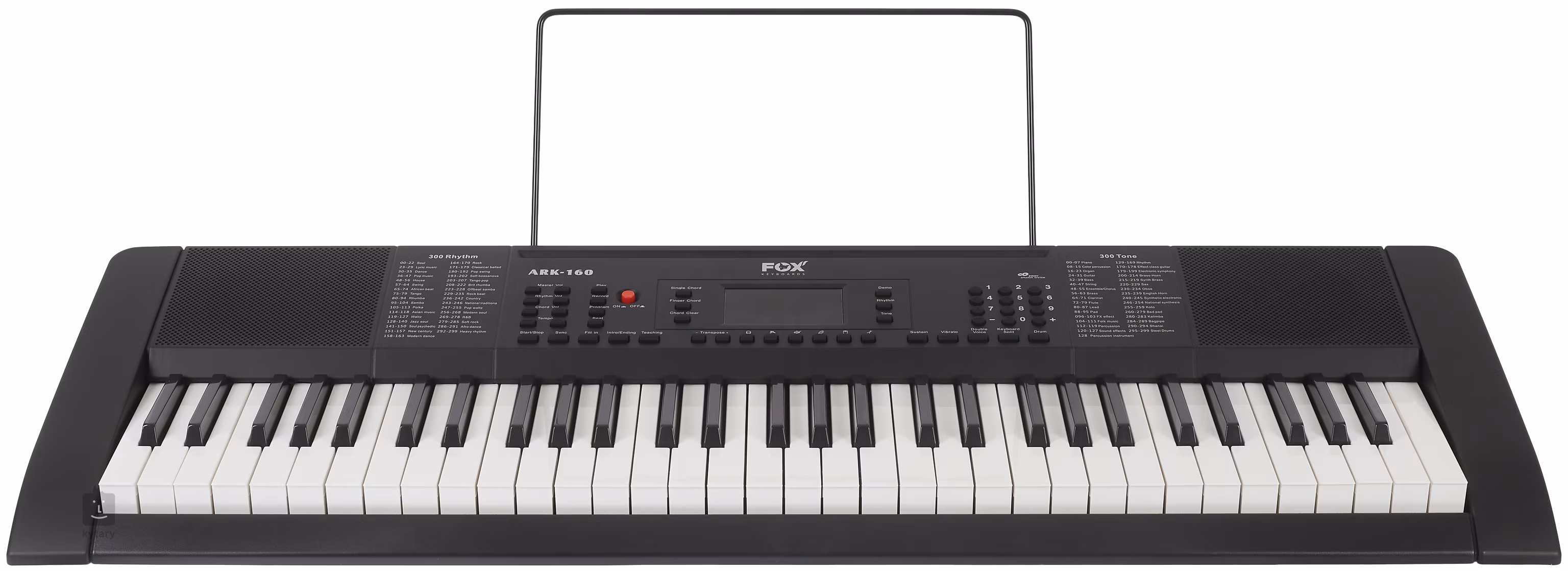 Le FOX 160 offre 61 touches de taille standard, 128 sons et 128 accompagnements automatiques. Il existe également des fonctions avancées telles que Split (division du clavier pour jouer deux instruments en meme temps), Dual Voice (superposition de sons) et les réglages Sustaine (réverbération) et Vibrato. Le clavier peut également etre transposé, ce que les débutants et les joueurs avancés apprécieront. Il est également possible de jouer des accords avec un seul doigt, une fonction d'enregistrement pour enregistrer vos expériences, ou encore un métronome et un systeme de tutoriel. Un microphone peut etre connecté aux touches.