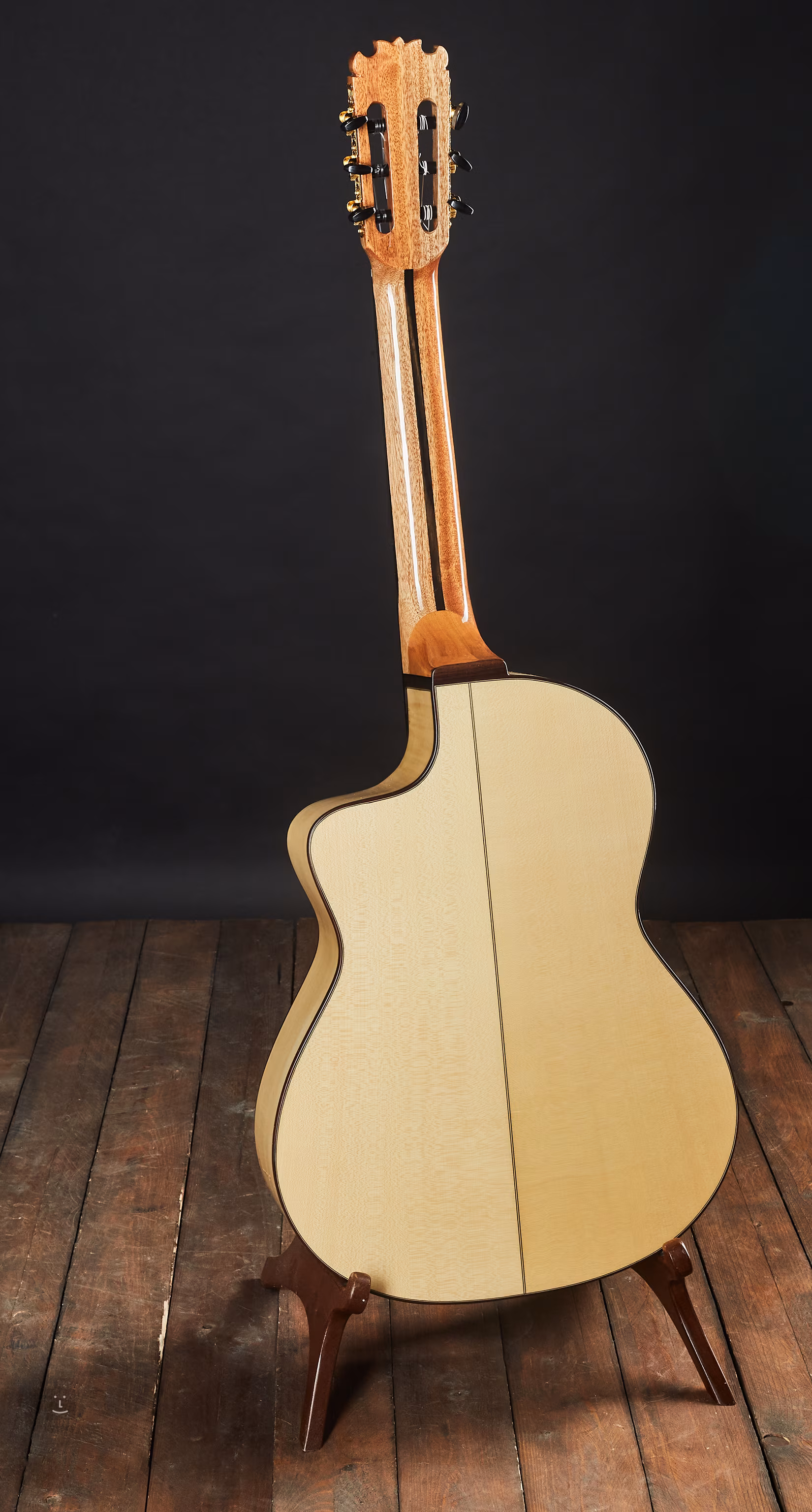 La guitare a une construction entièrement massive. La table est en épicéa allemand sélectionné, le dos et les éclisses sont en érable sélectionné. Le manche est en cèdre de 50 ans d'âge avec un barrage en ébène. La touche est en ébène, la touche est en palissandre. La touche et la frette zéro sont en os (fait à la main). Les cordes sont des cordes espagnoles Knobloch Medium.