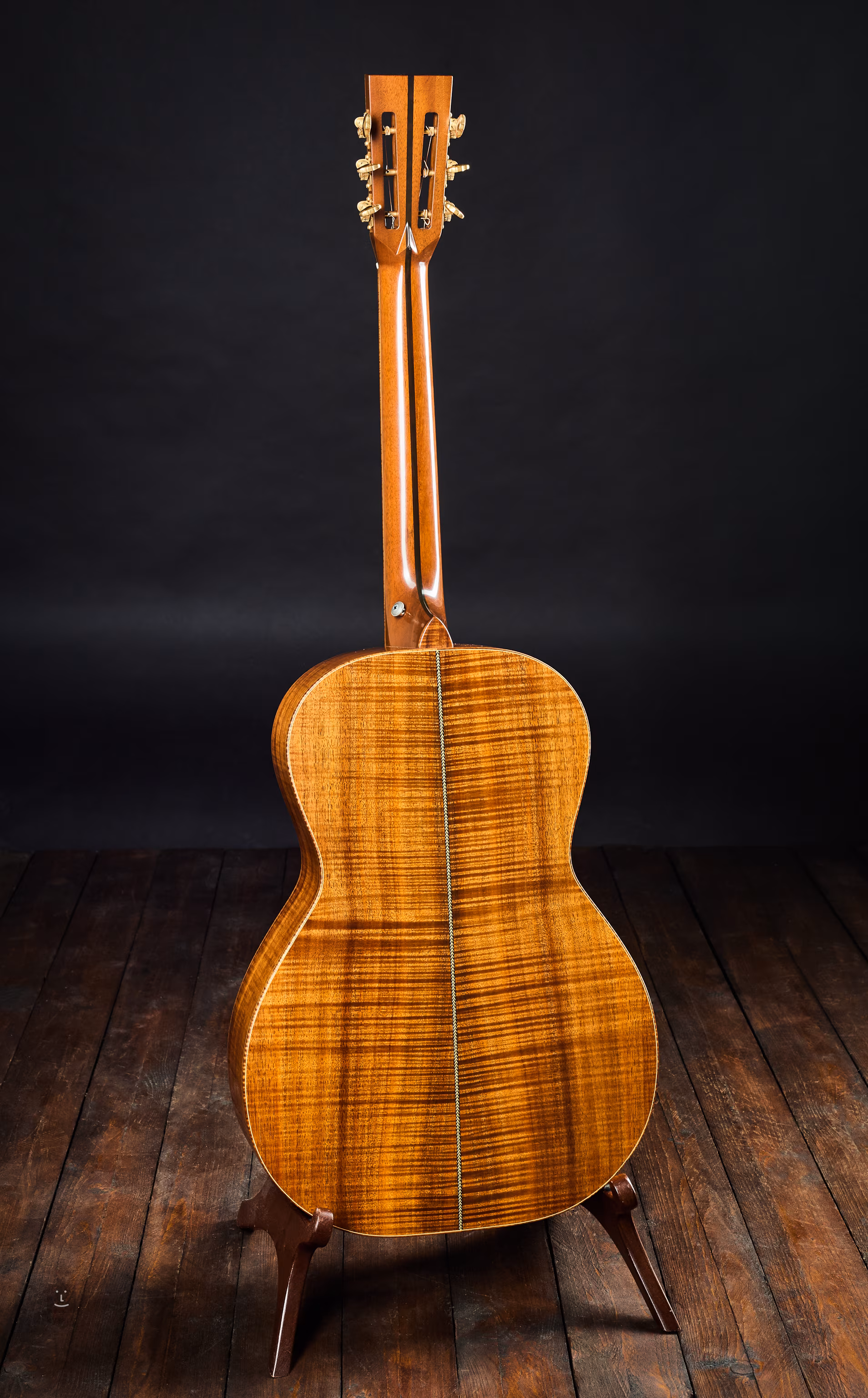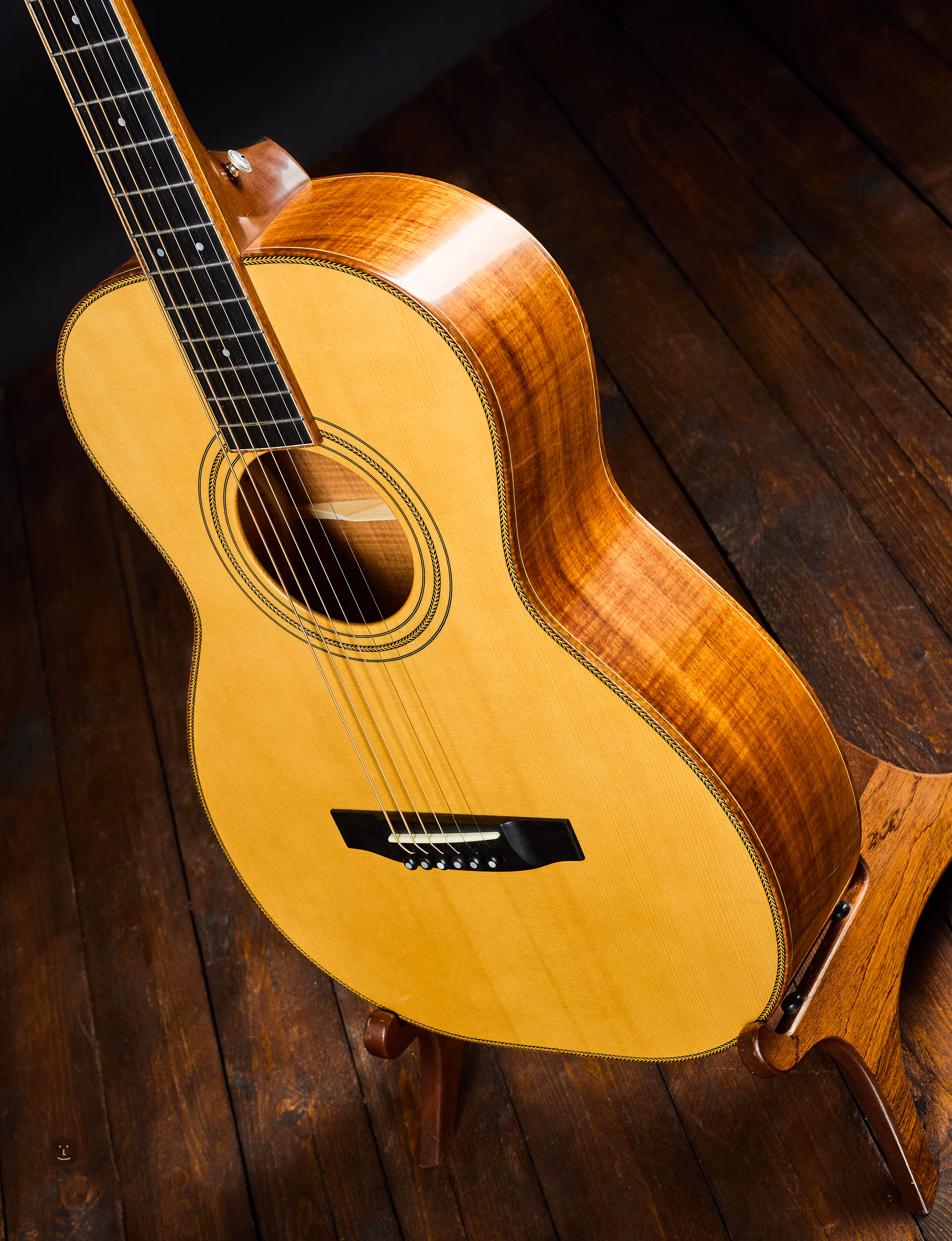 Les bois utilisés pour la fabrication de l'instrument sont très sélectifs et extra. La table d'harmonie est en épicéa alpin ; la touche et le manche sont en ébène ; les éclisses et le dos sont une sélection de bois de koa.
