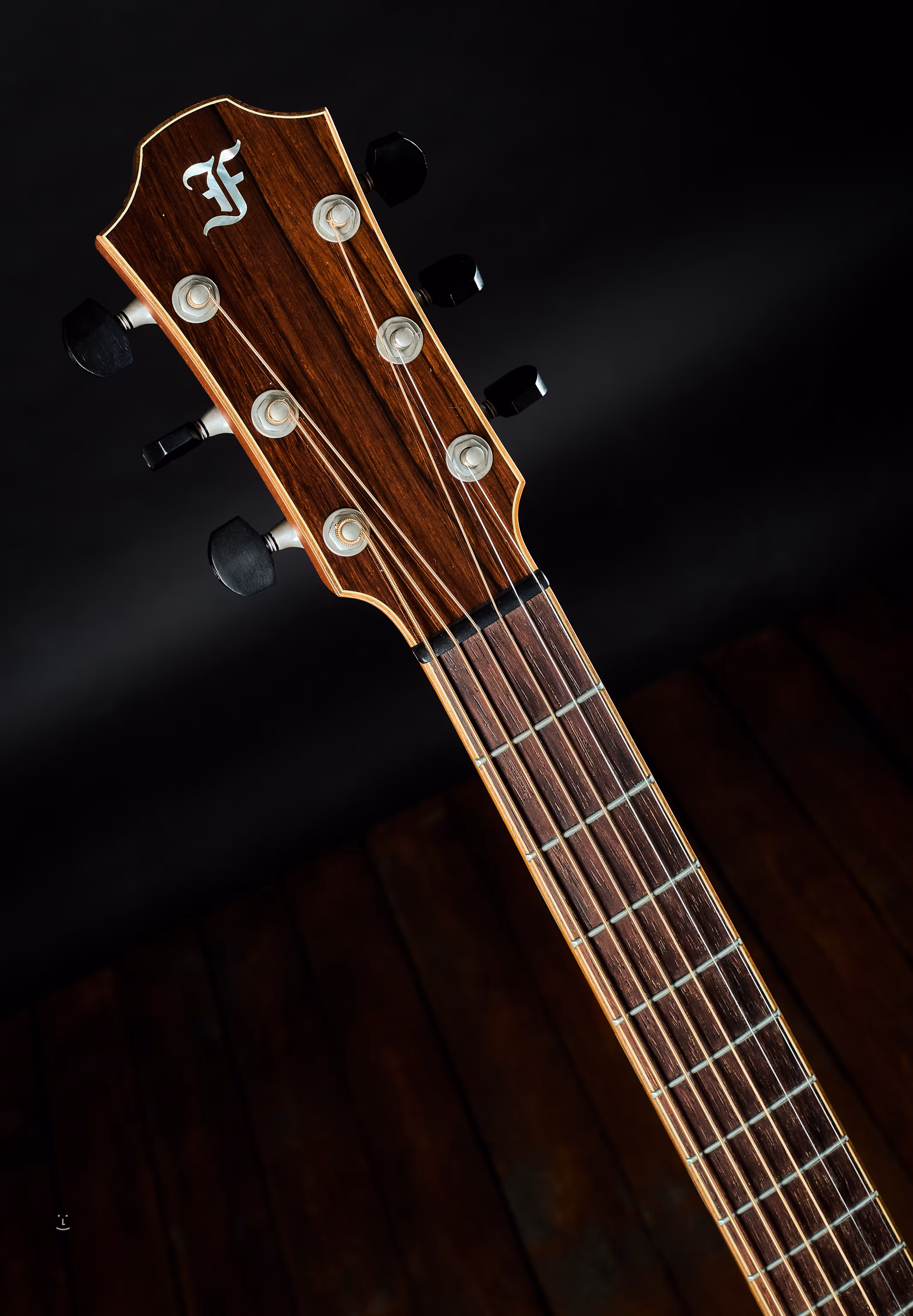 La table d'harmonie du luxueux modèle Super Jumbo Sc Rainbow-SR est fabriquée en séquoia récolté dans les rivières, tandis que le dos et les éclisses sont en palissandre indien de qualité supérieure. La finition du corps Full-Pore High-Gloss, une laque à pores pleins et à haute brillance, améliore les propriétés acoustiques de la guitare, offre une excellente protection de la surface et met en valeur la texture naturelle du bois. Le barrage du manche à deux voies du système CNR de Furch ajoute de la force, de la stabilité et de la durabilité.