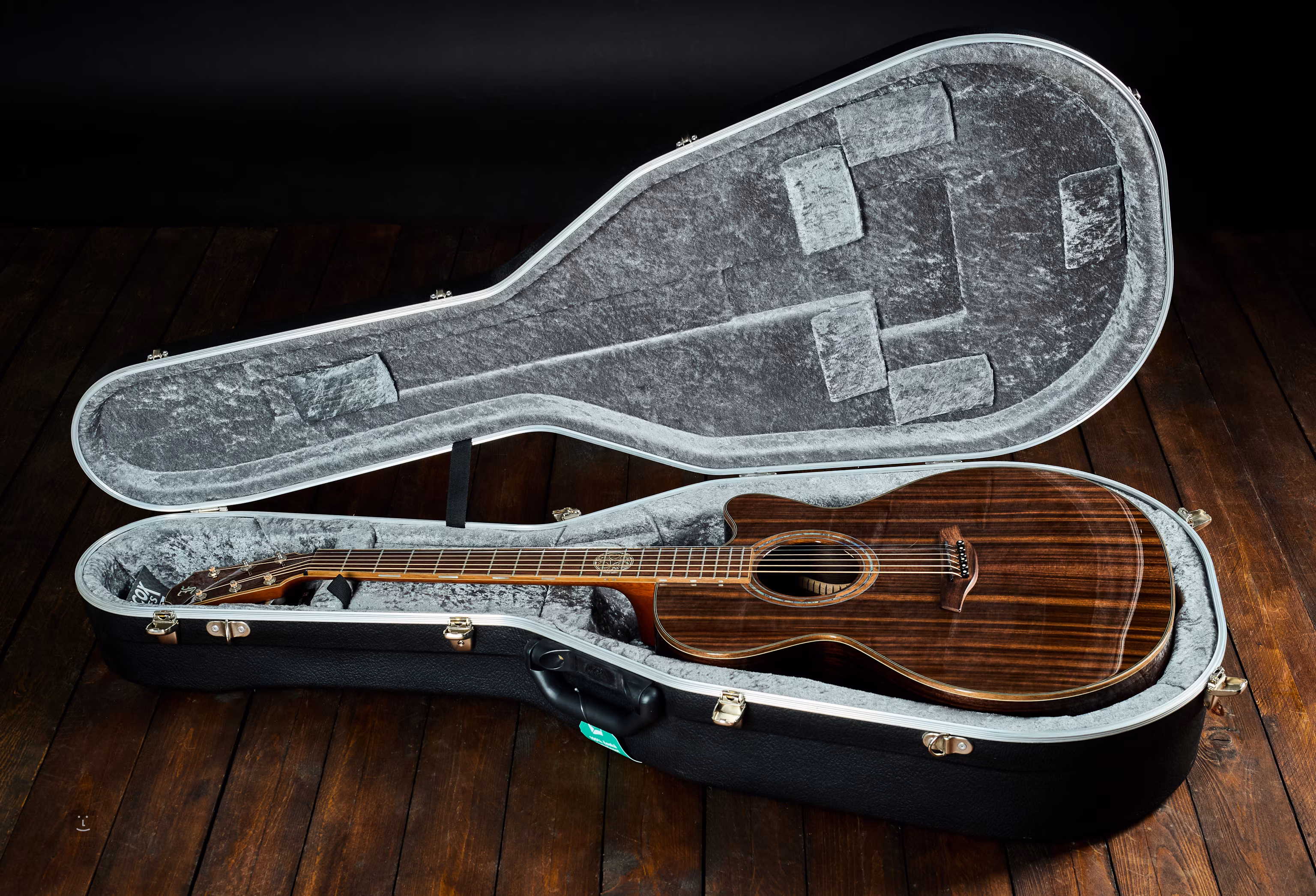La touche et la tête sont en palissandre de Madagascar. La surface de la touche est décorée d'une incrustation de nacre sur la douzième frette. L'aspect raffiné de la guitare est accentué par le corps, la touche et la tête en noyer noir avec des lignes contrastées blanches, une incrustation en noyer noir et blanc sur la face avant, une incrustation centrale sur la face arrière en noyer noir avec des lignes contrastées blanches sur les deux faces, une rosace décorative composée d'un anneau en noyer noir massif de première qualité et de nacre, une tranche de tête en palissandre de Madagascar et des chevilles en ébène sur le manche avec des œillets en nacre. Le pickguard transparent laisse ressortir le grain naturel du bois sans affecter la résonance de la table d'harmonie. La stabilité de l'accordage est garantie par les mécaniques de haute qualité Gotoh 510 Nickel patina avec chevilles en ébène.