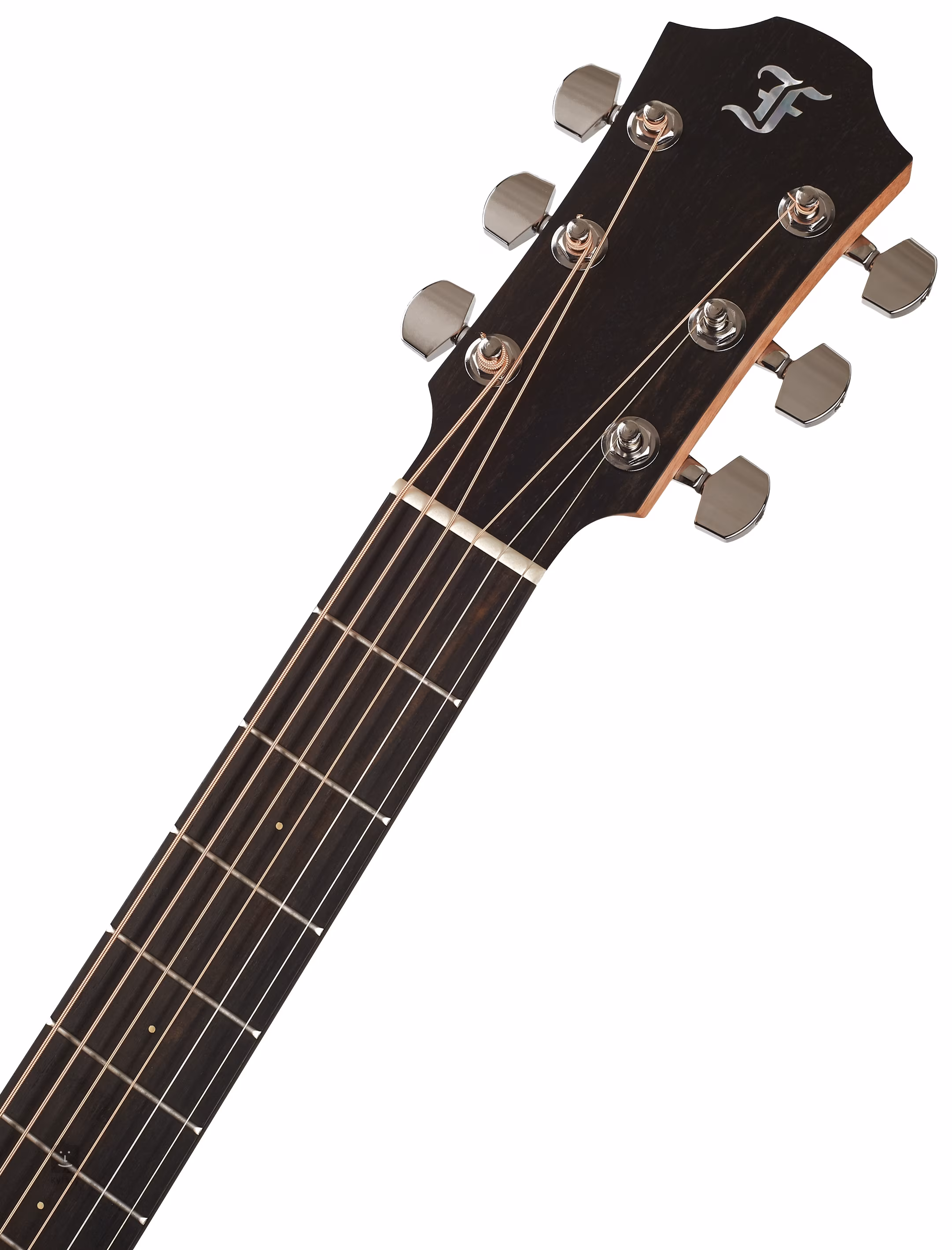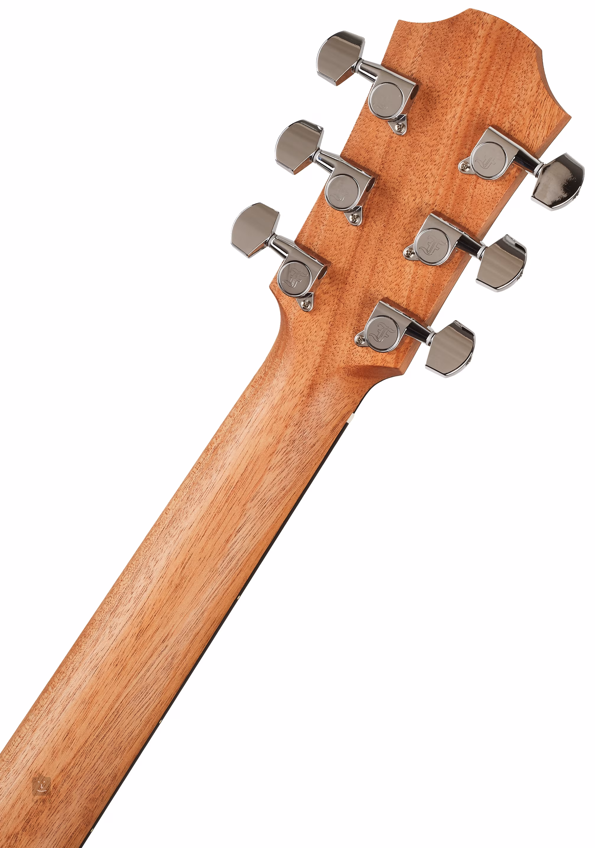 L'orientation sur la touche en ébène est facilitée par des repères de position latéraux et frontaux. Les frettes aux pieds raccourcis ne s'étendent délibérément pas jusqu'aux bords de la touche, ce qui évite qu'elles ne montent en raison de l'affaissement de la touche en cas de faible humidité. La précision et la stabilité de l'accordage sont garanties par les mécaniques chromées de l'entreprise, avec un rapport d'engrenage de 1:18.