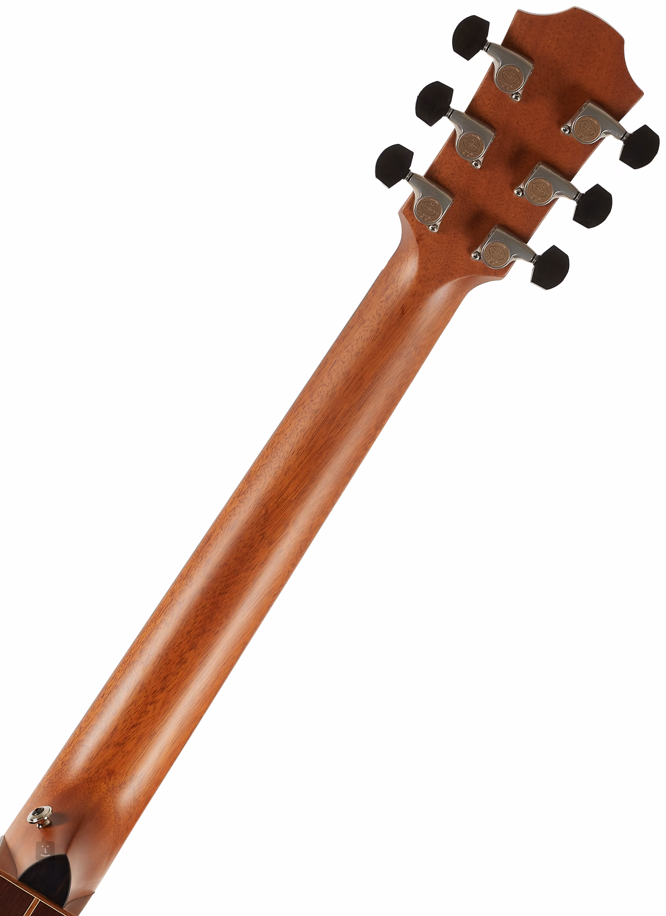 La touche et la tête sont en palissandre de Madagascar. La surface de la touche est décorée de repères de position en nacre. Le look raffiné de la guitare est accentué par la bordure du corps en koa hawaïen, le pickguard à motif de chevrons, la rosette à double anneau bordée de perles, la bande centrale de la table d'harmonie en koa, et les chevilles en ébène sur le manche avec des œillets en perle. Le pickguard transparent laisse ressortir le grain naturel du bois sans affecter la résonance de la table d'harmonie. La stabilité de l'accordage est garantie par les mécaniques de haute qualité Gotoh 510 Nickel patina avec chevilles en ébène.