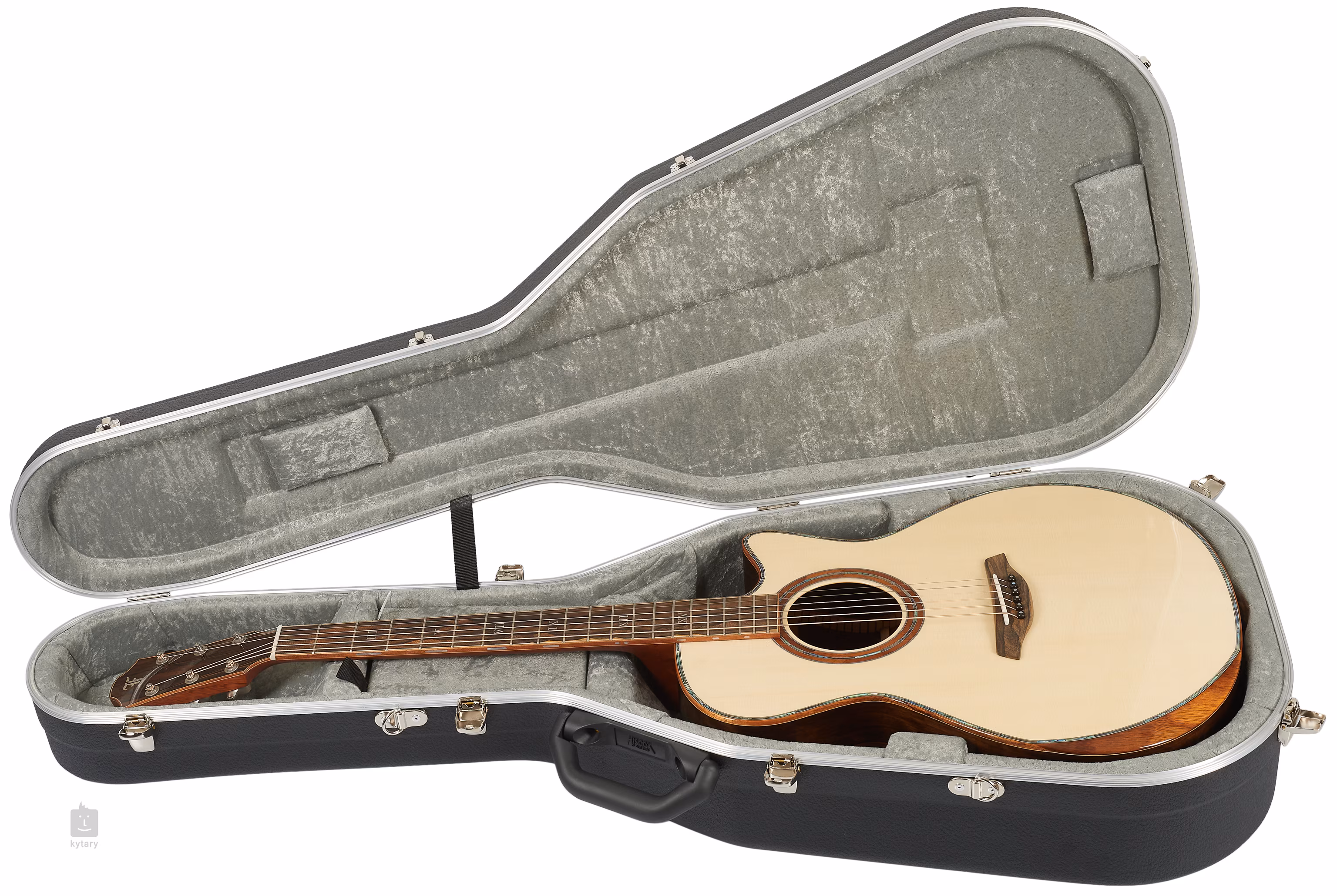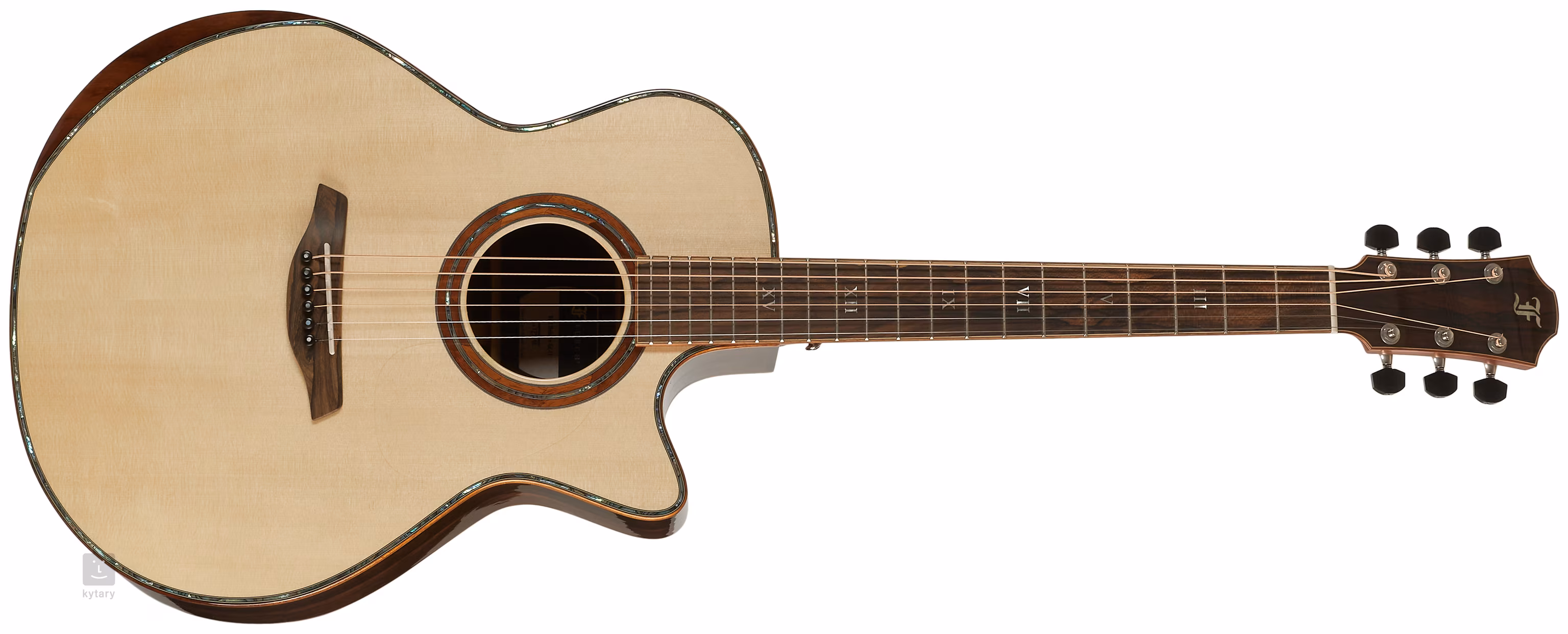 L'apparence extraordinaire de la guitare est soulignée par la combinaison de la touche, de la tête et de la plaque de tête en bois exclusif de ziricote d'Amérique centrale avec un grain distinctif. La beauté des bois utilisés est soulignée par un certain nombre de détails décoratifs, tels que le binding et la rosace en koa hawaïen, l'incrustation de perles (abalone) sur la table d'harmonie ou les chiffres romains en perle sur la touche.