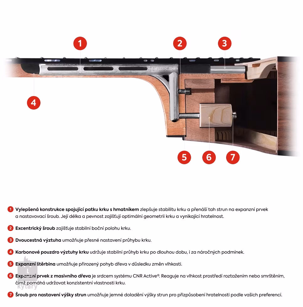Le système CNR Active Bracing assure la durabilité de l'instrument et une bonne jouabilité (matchmaking) même dans les conditions climatiques les plus difficiles, c'est-à-dire que le système adapte l'ajustement du manche aux changements d'humidité. Ce système permet également un réglage rapide et facile du manche (augmentation ou diminution de la postcombustion).