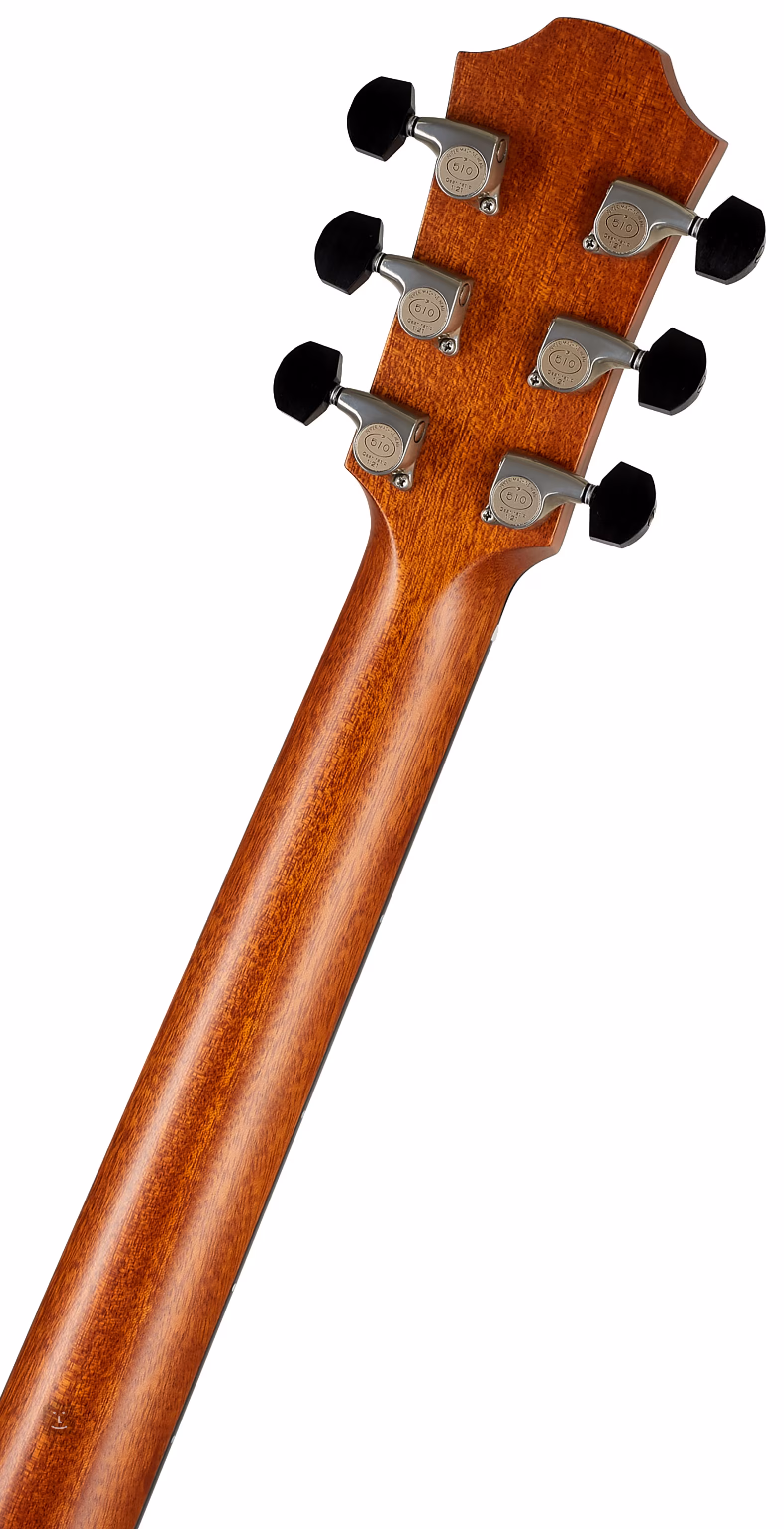 L'orientation sur la touche en ébène est facilitée par d'élégants repères de position circulaires à l'avant, avec une fine ligne de contour en nacre blanche, et des repères latéraux en nacre. Le pickguard transparent laisse ressortir le grain naturel du bois sans affecter la résonance de la table d'harmonie. La stabilité de l'accordage est garantie par le mouvement Gotoh 510 de qualité supérieure, de patine argentée, avec des chevilles en ébène polies et un rapport d'engrenage très raffiné de 1:21. La finesse de la fabrication est accentuée par des détails raffinés tels que la reliure du corps en fausse écaille de tortue et la rosace à double anneau avec incrustation d'abalone vert avec une ligne noire et blanche.