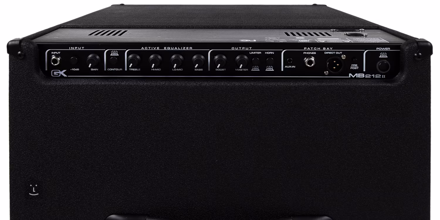Ces éléments, ainsi que les commandes, sont situés sur le panneau supérieur. Pour ajuster le son, il y a d'abord un contrôle de gain suivi d'un égaliseur à 4 bandes composé de potentiomètres Treble (aigus), Hi-Mid (hauts médiums), Lo-Mid (bas médiums) et Bass (graves). Les derniers potentiomètres sont le Boost, qui fonctionne comme un gain après l'égaliseur, et le Master pour ajuster le volume global. Le panneau avant permet également d'activer les fonctions Contour et Limiter.